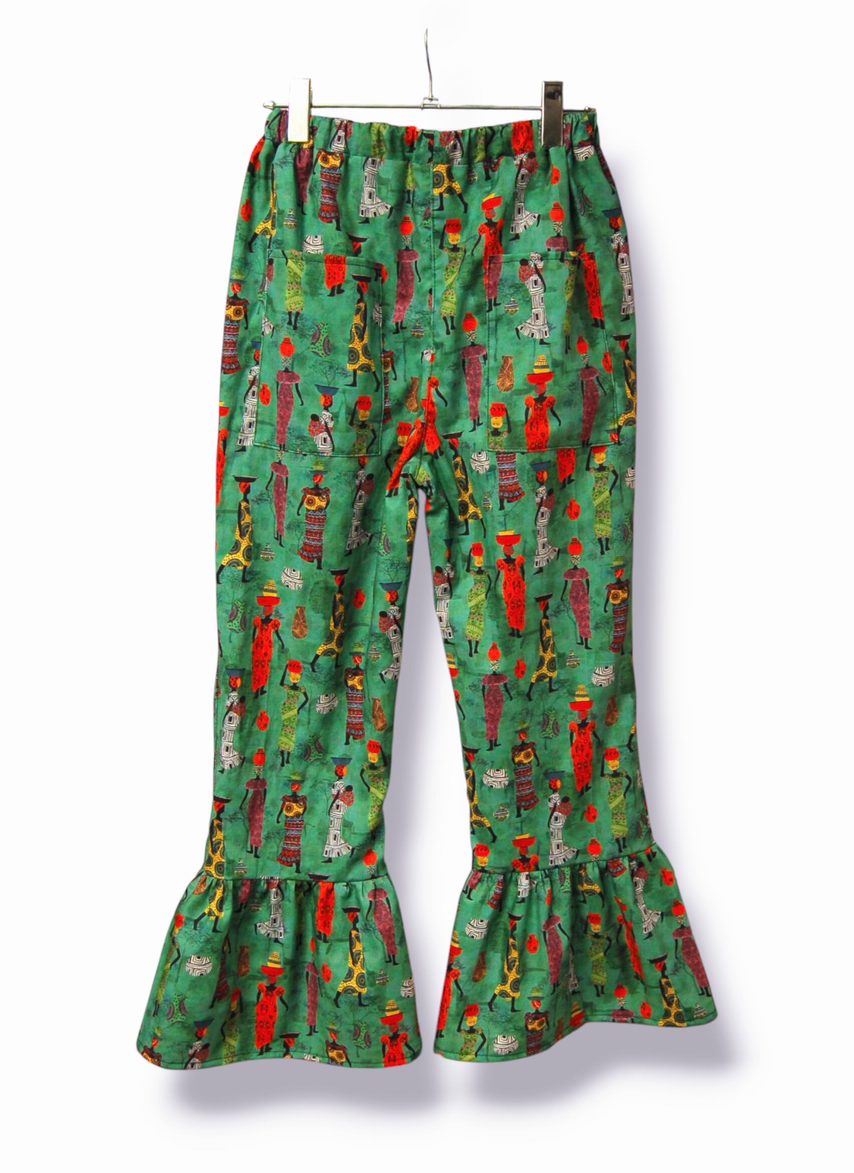 USAcotton アフリカンデザイン 裾フリルフレアパンツ。