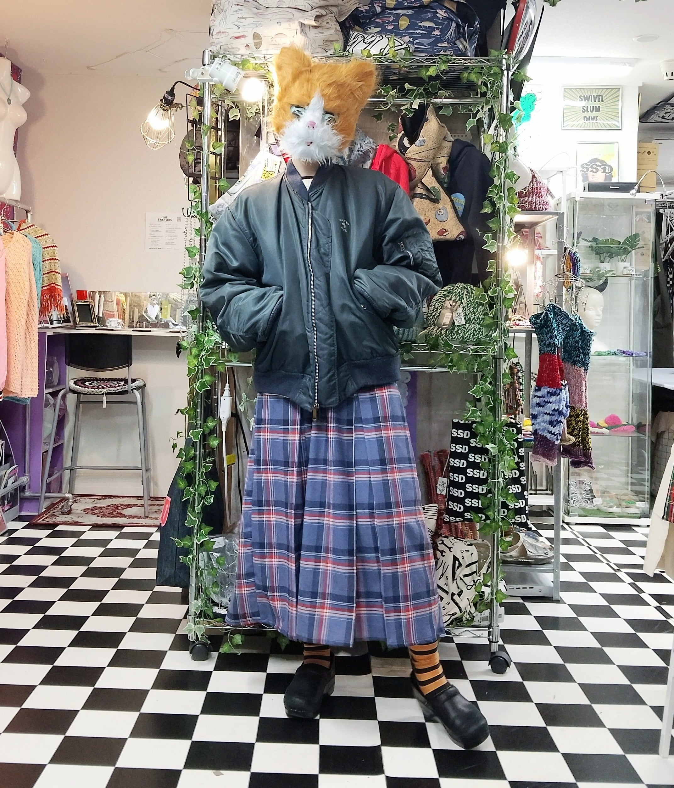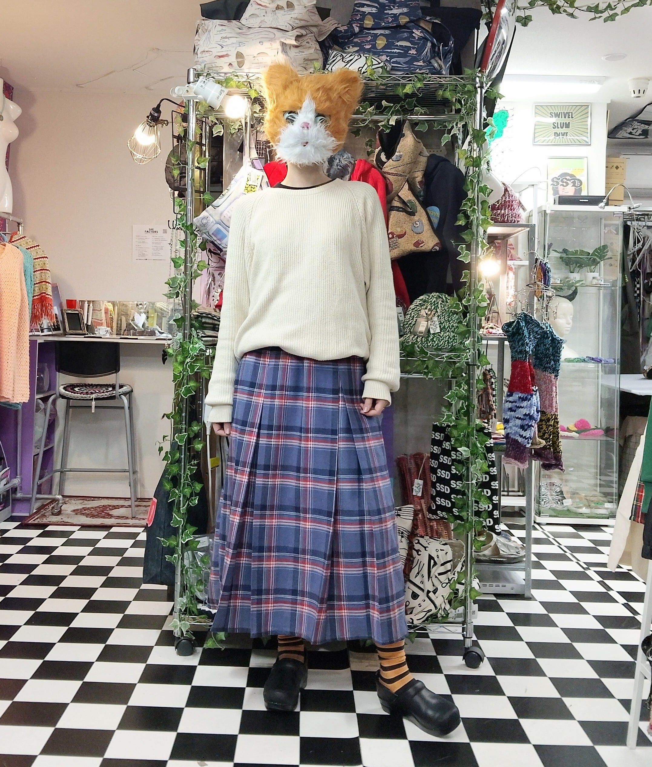 水色ベースのタータンチェックボックスプリーツロングスカート。