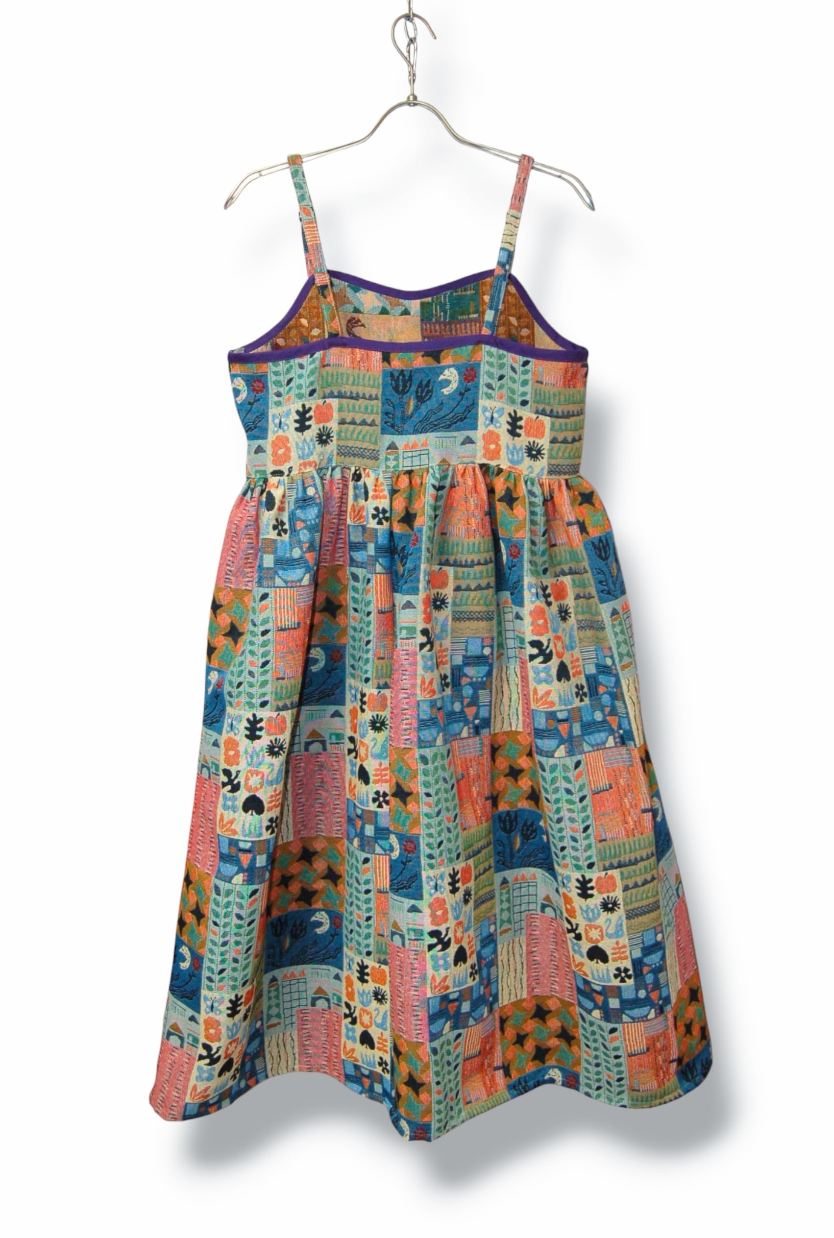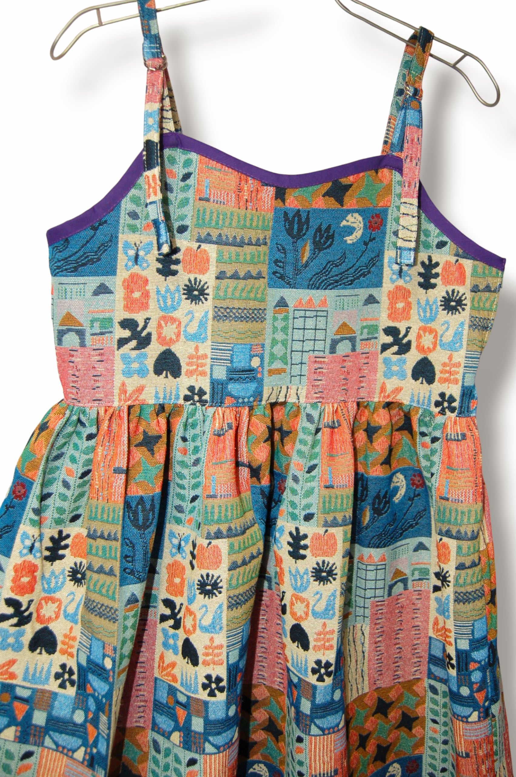 レトロパッチワークデザイン ゴブラン織生地のギャザーフレアロングワンピース。