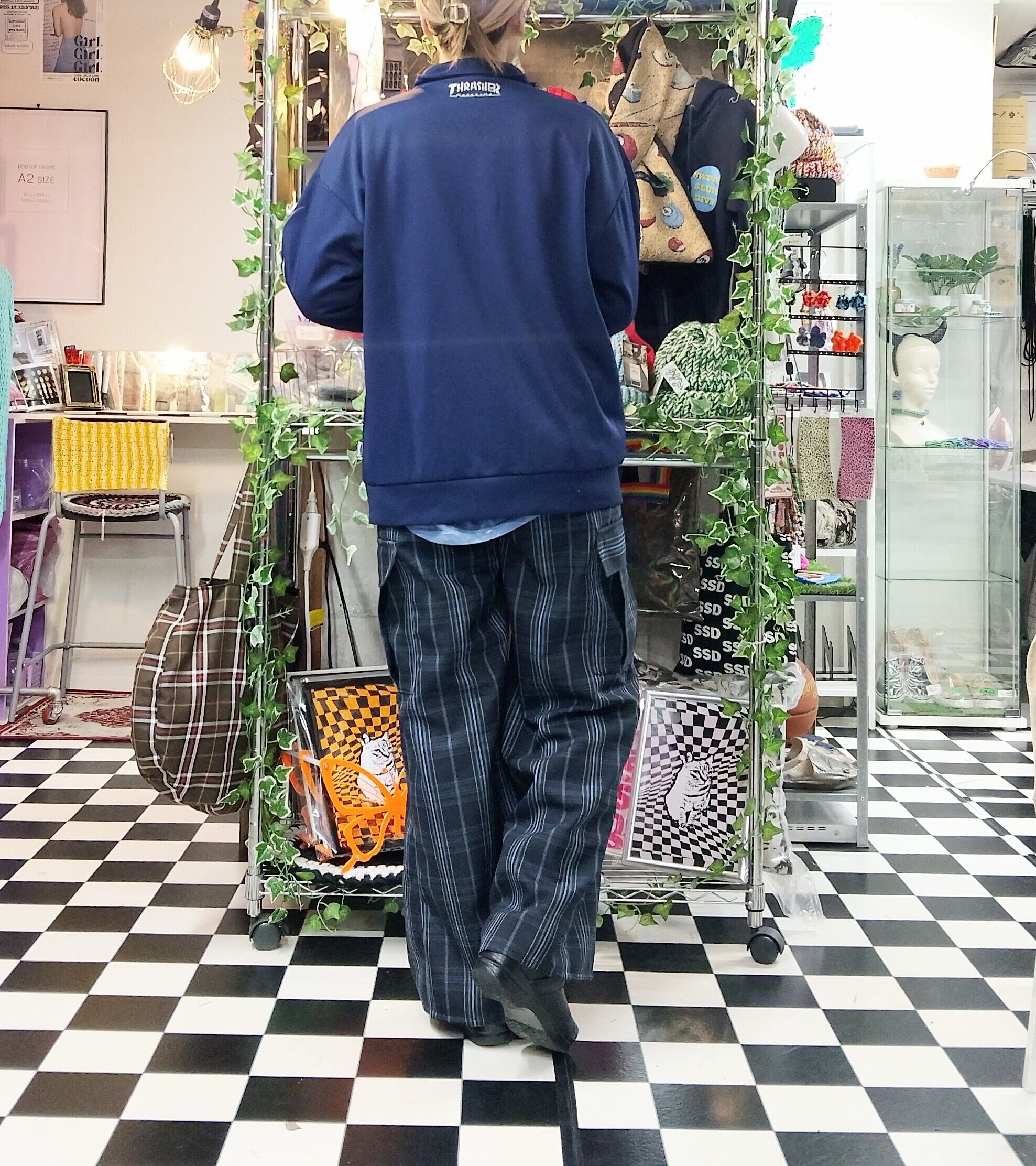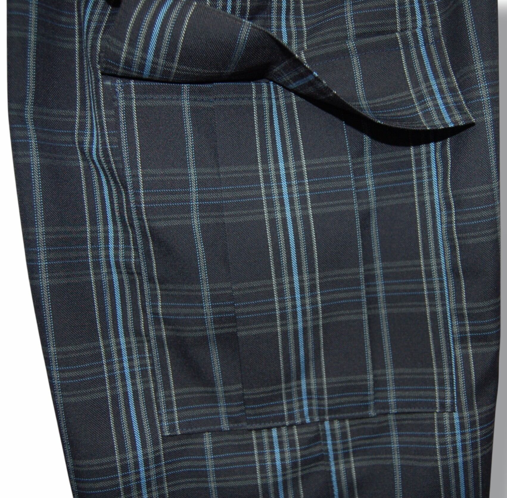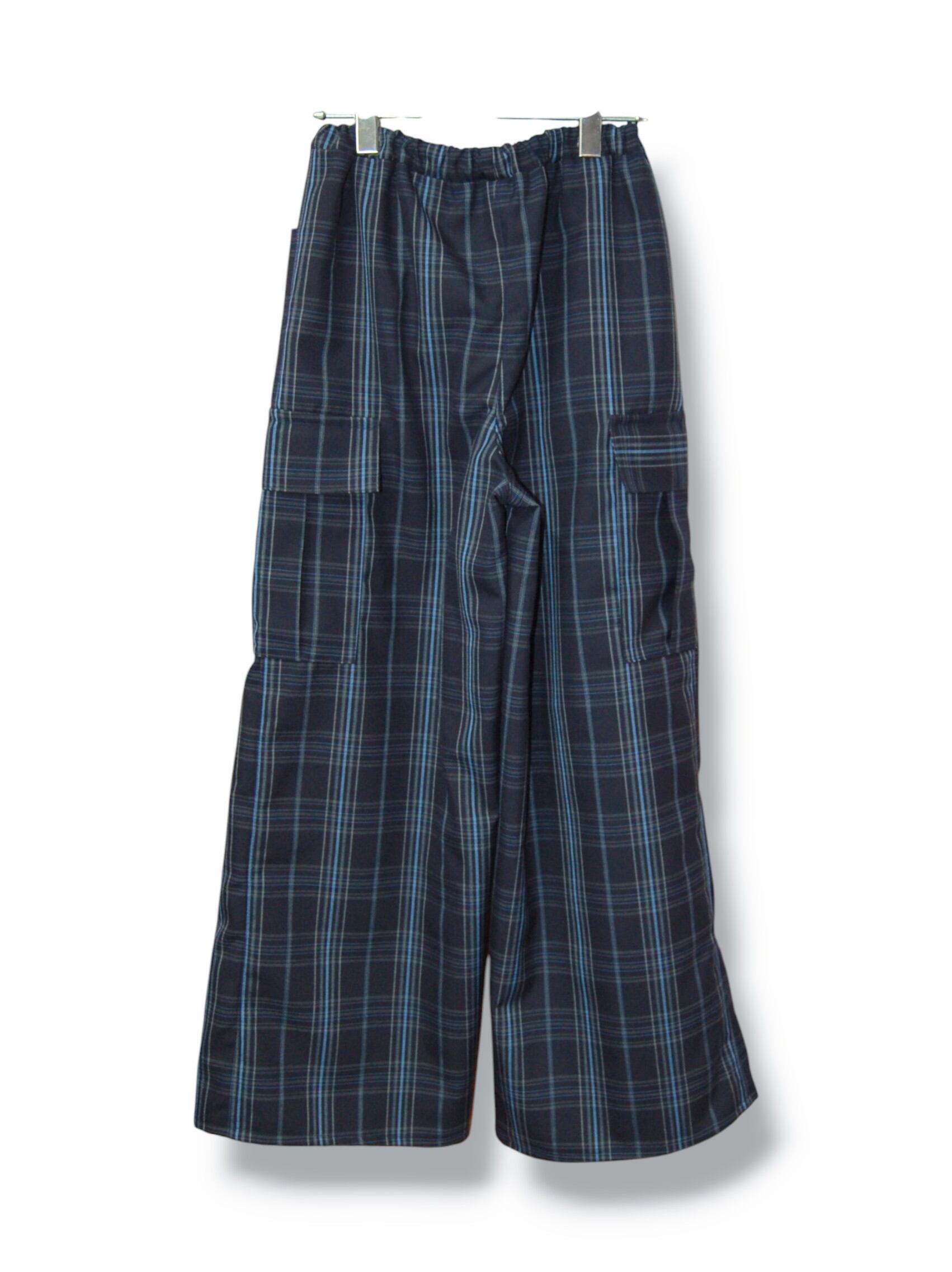 ネイビー×ブラックの落ち着いた色味のチェックカーゴワイドパンツ。
