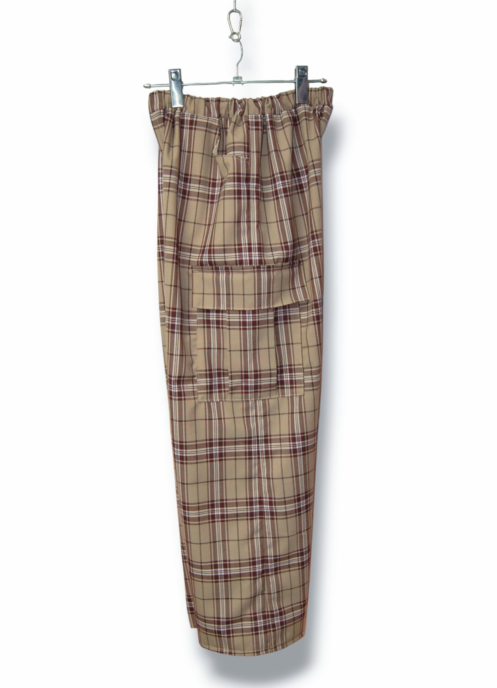 裏地付き モカベージュベースの落ち着いた色味のタータンチェックカーゴワイドパンツ。
