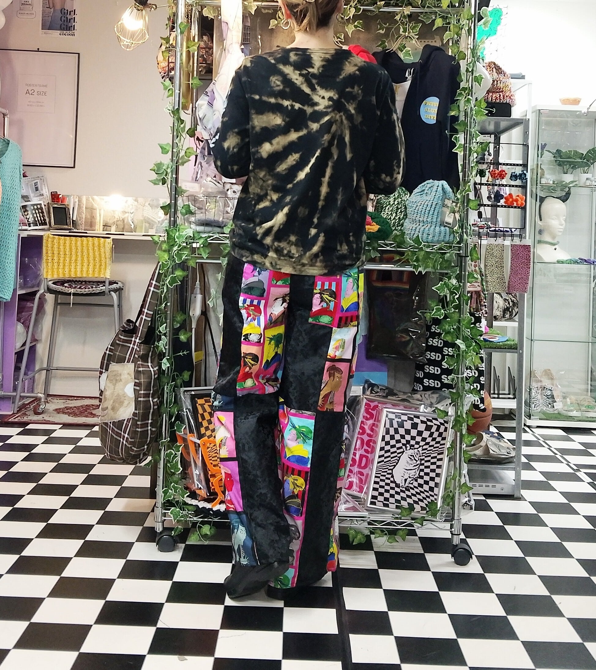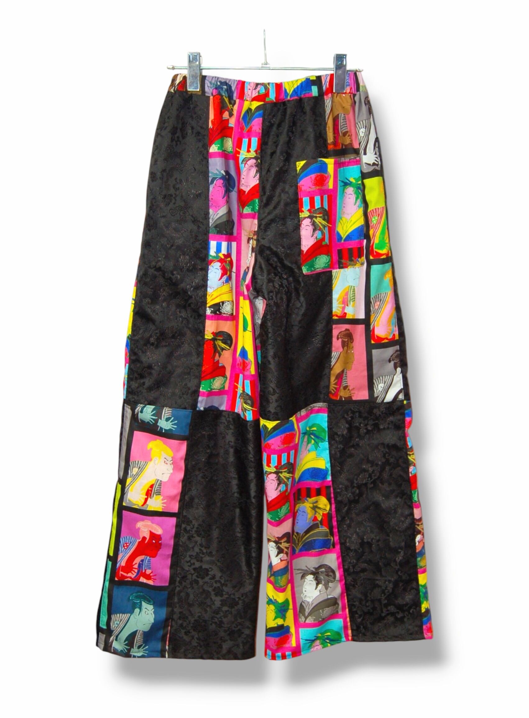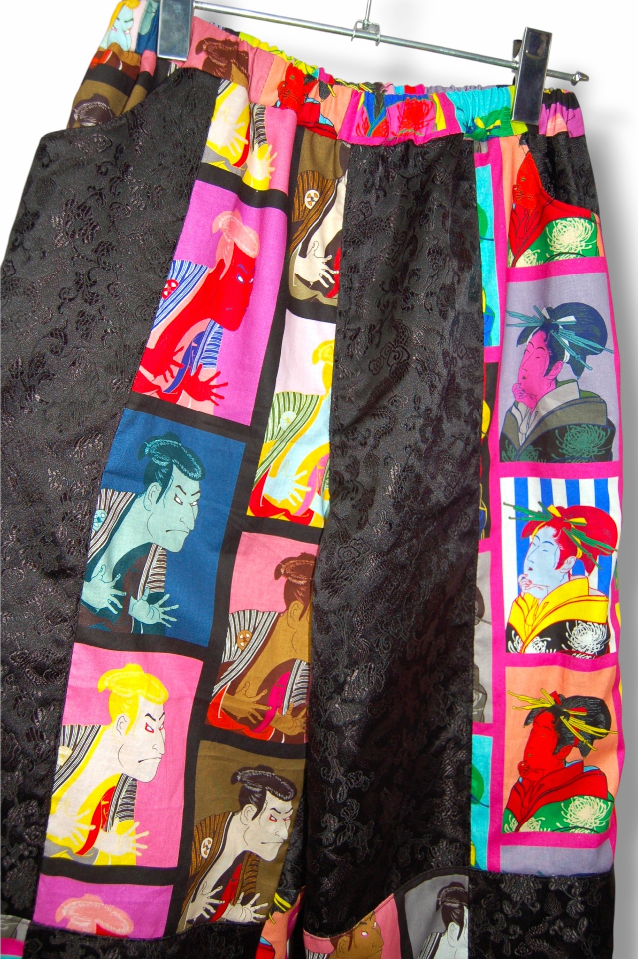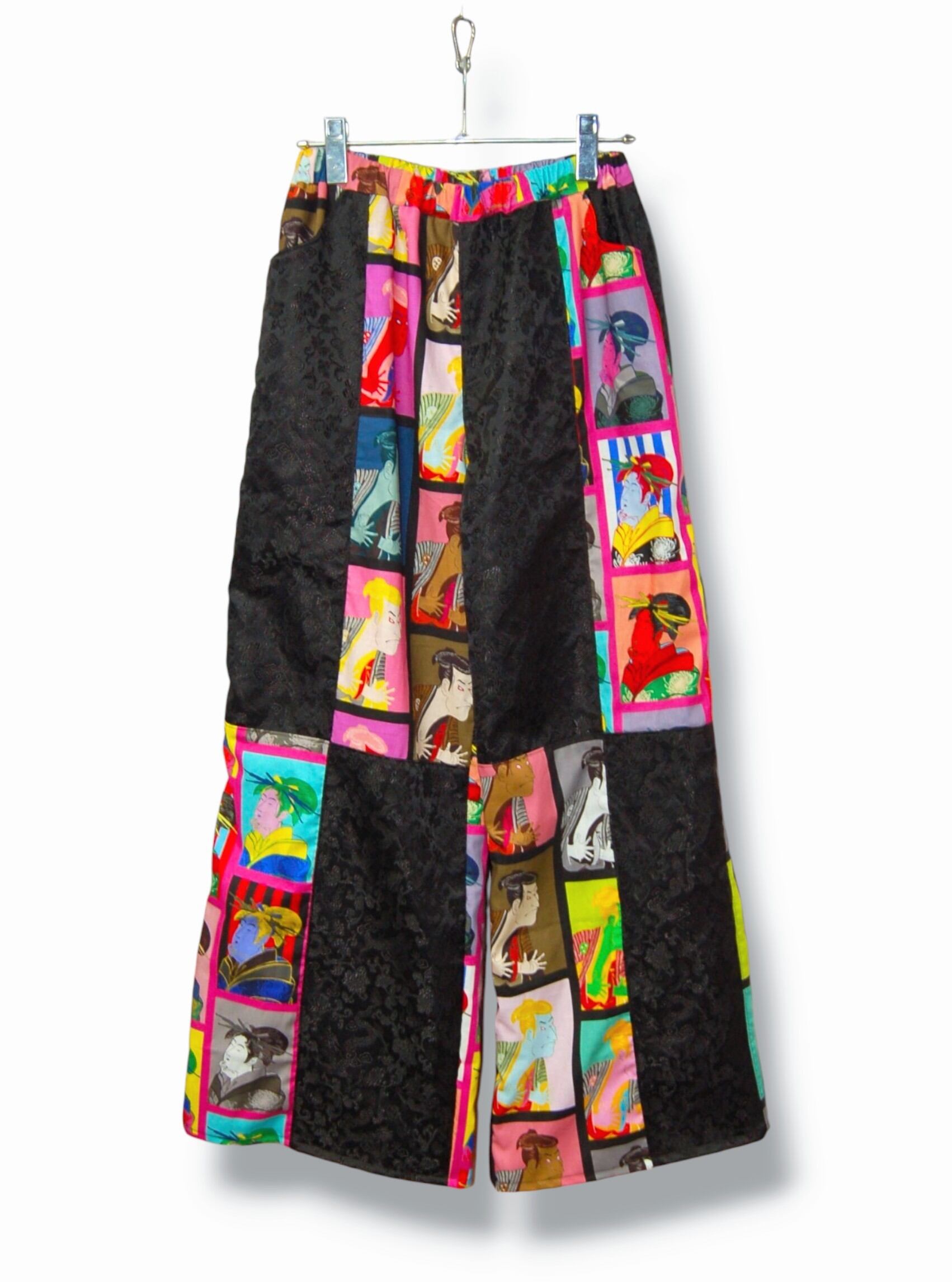 浮世絵 和柄デザインとチャイナ生地を合わせた異素材ミックスワイドパンツ。