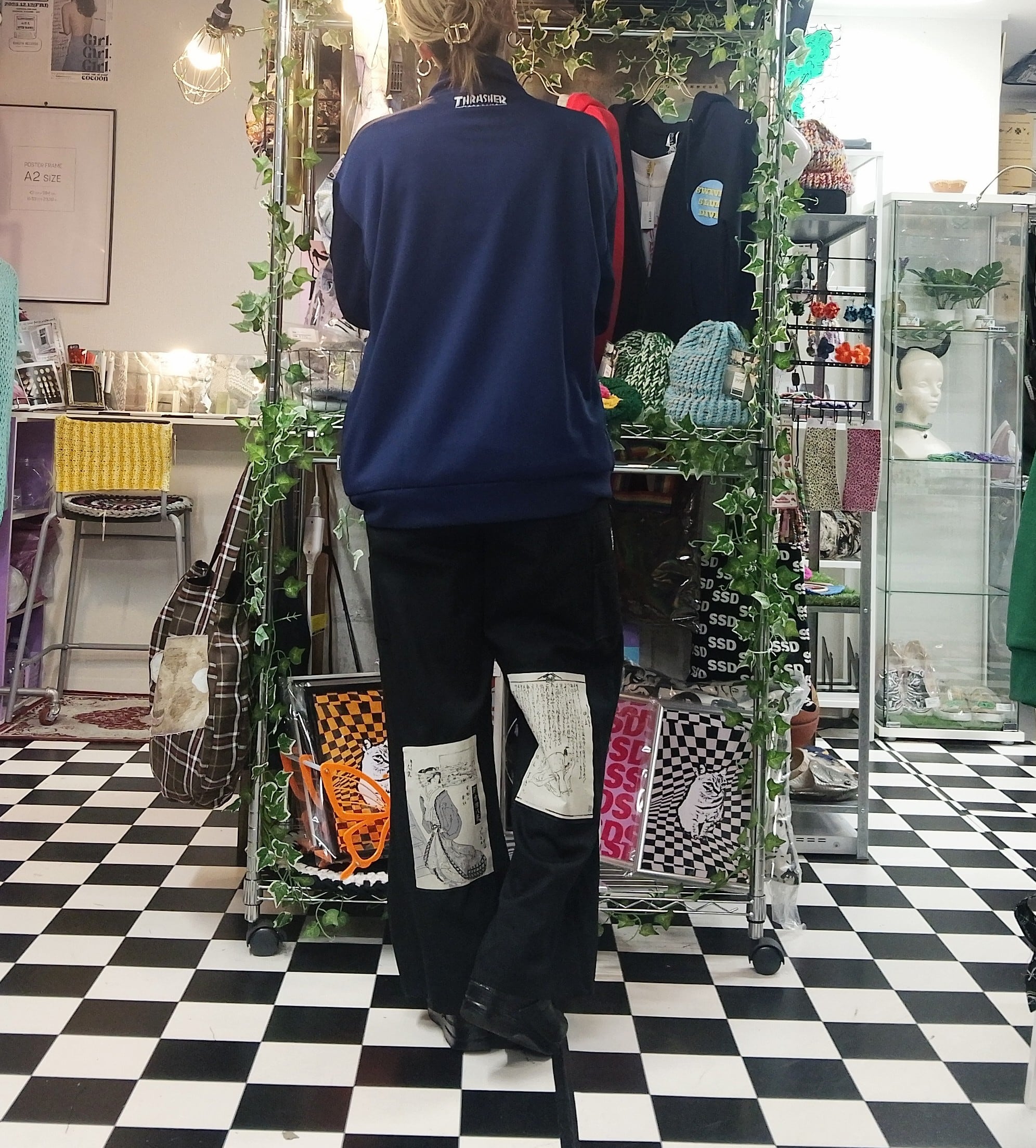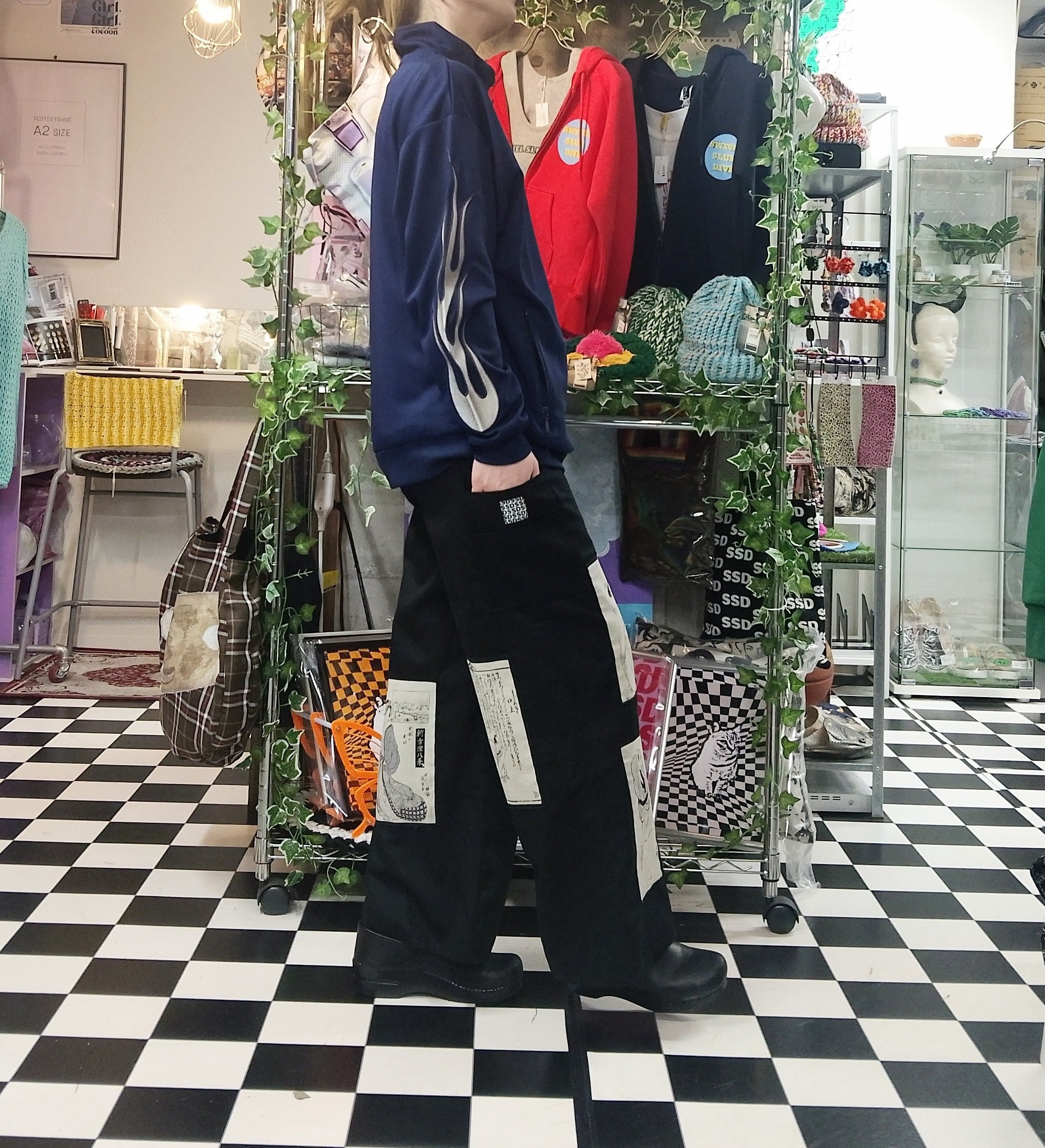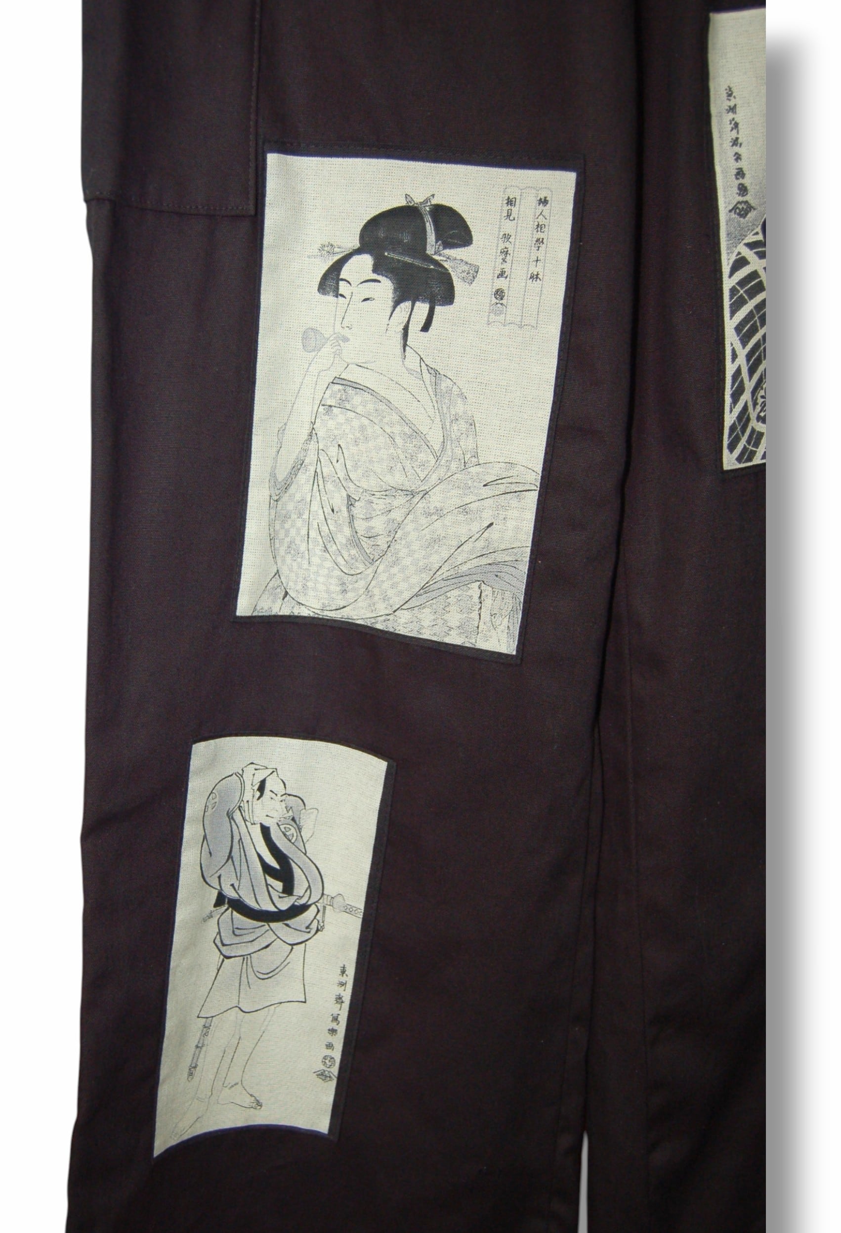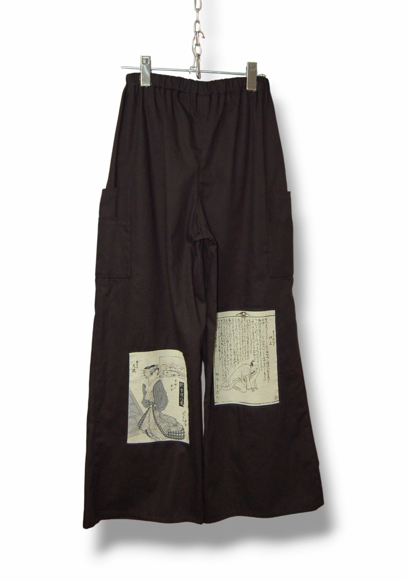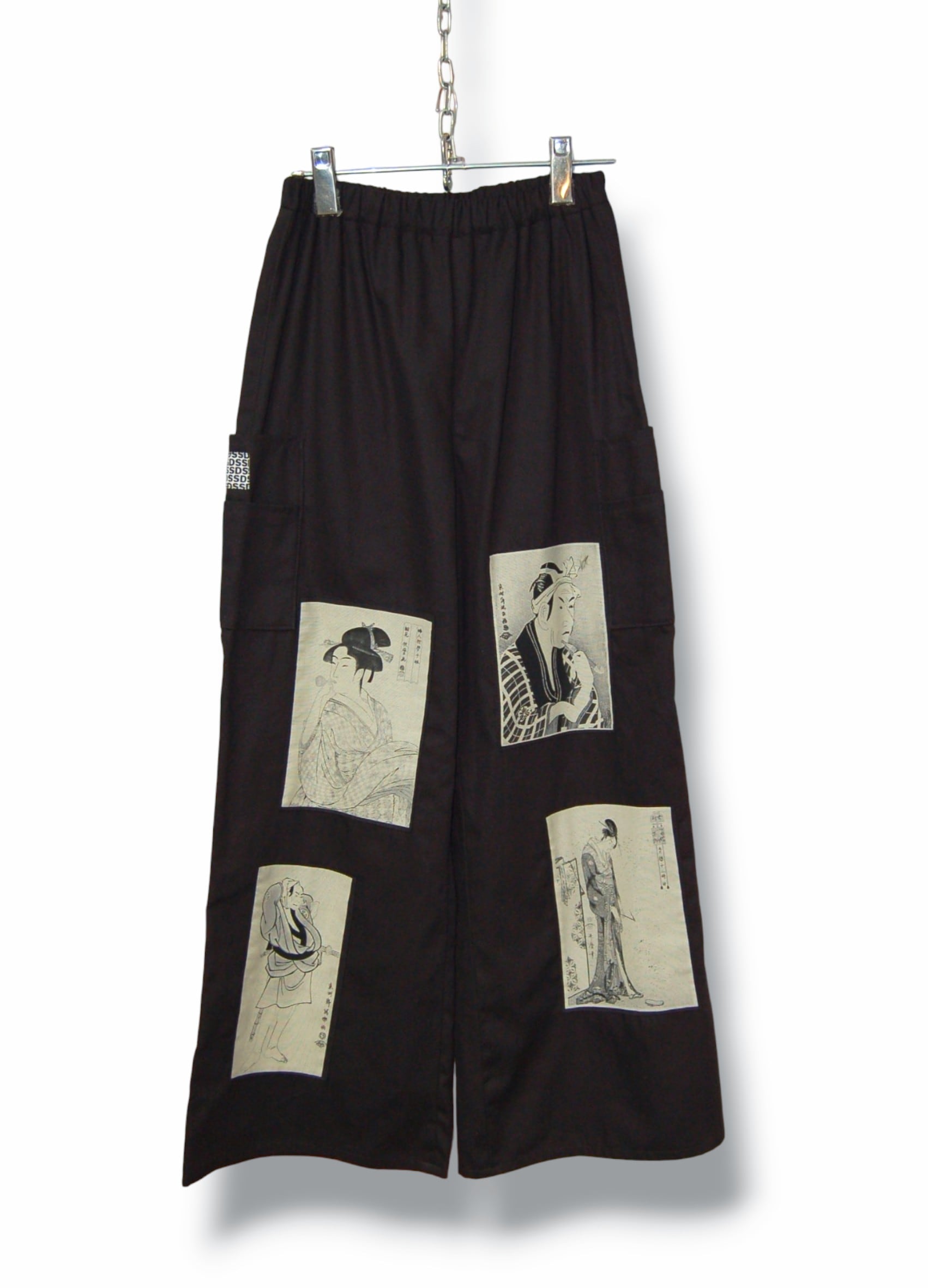 ブラックのワイドパンツベースに浮世絵デザインのパッチを合わせたコットンワイドパンツ。
