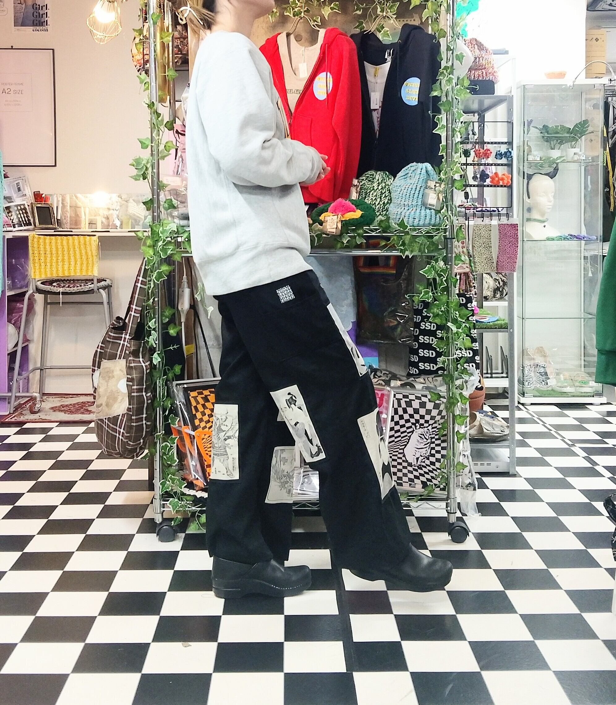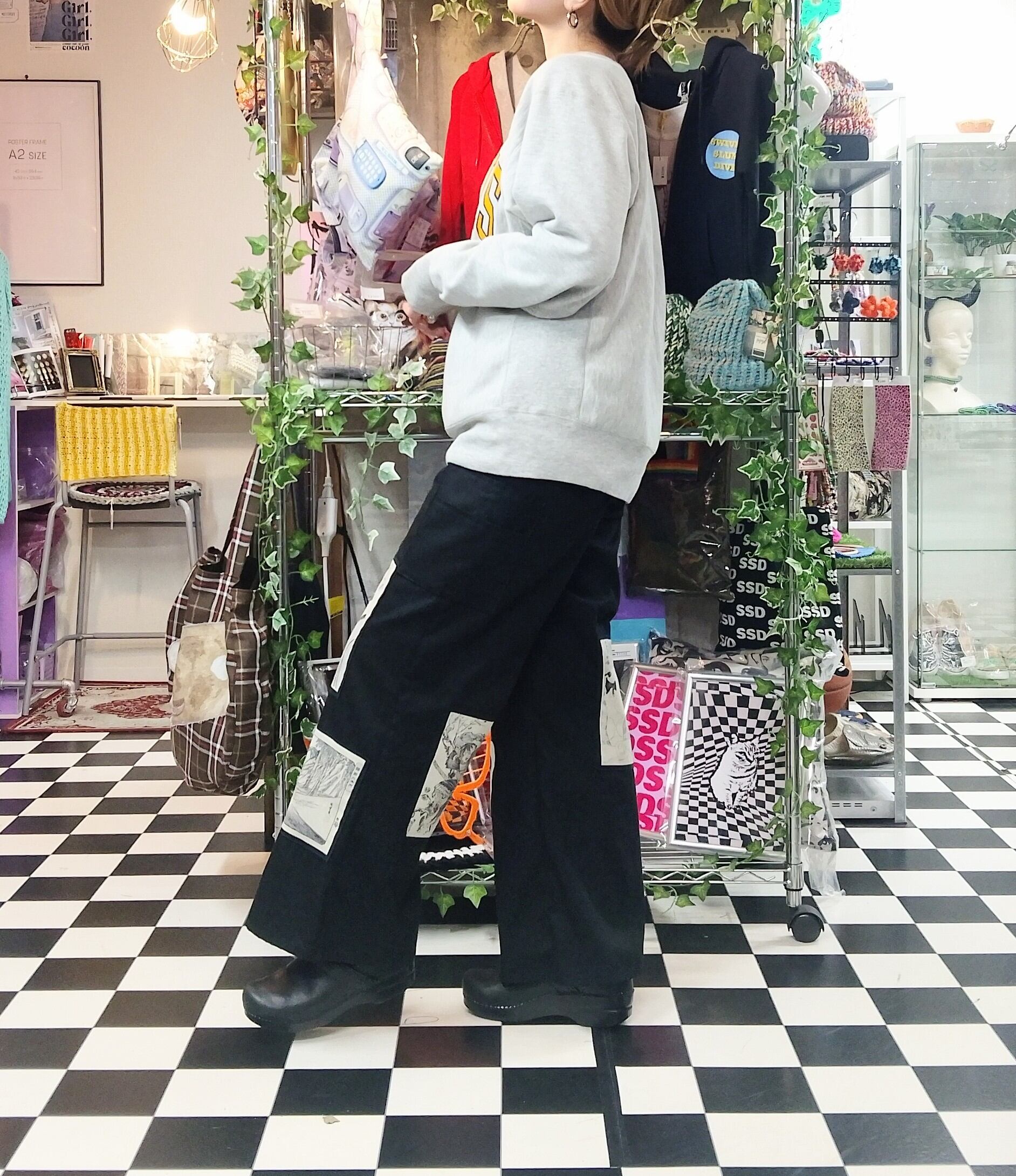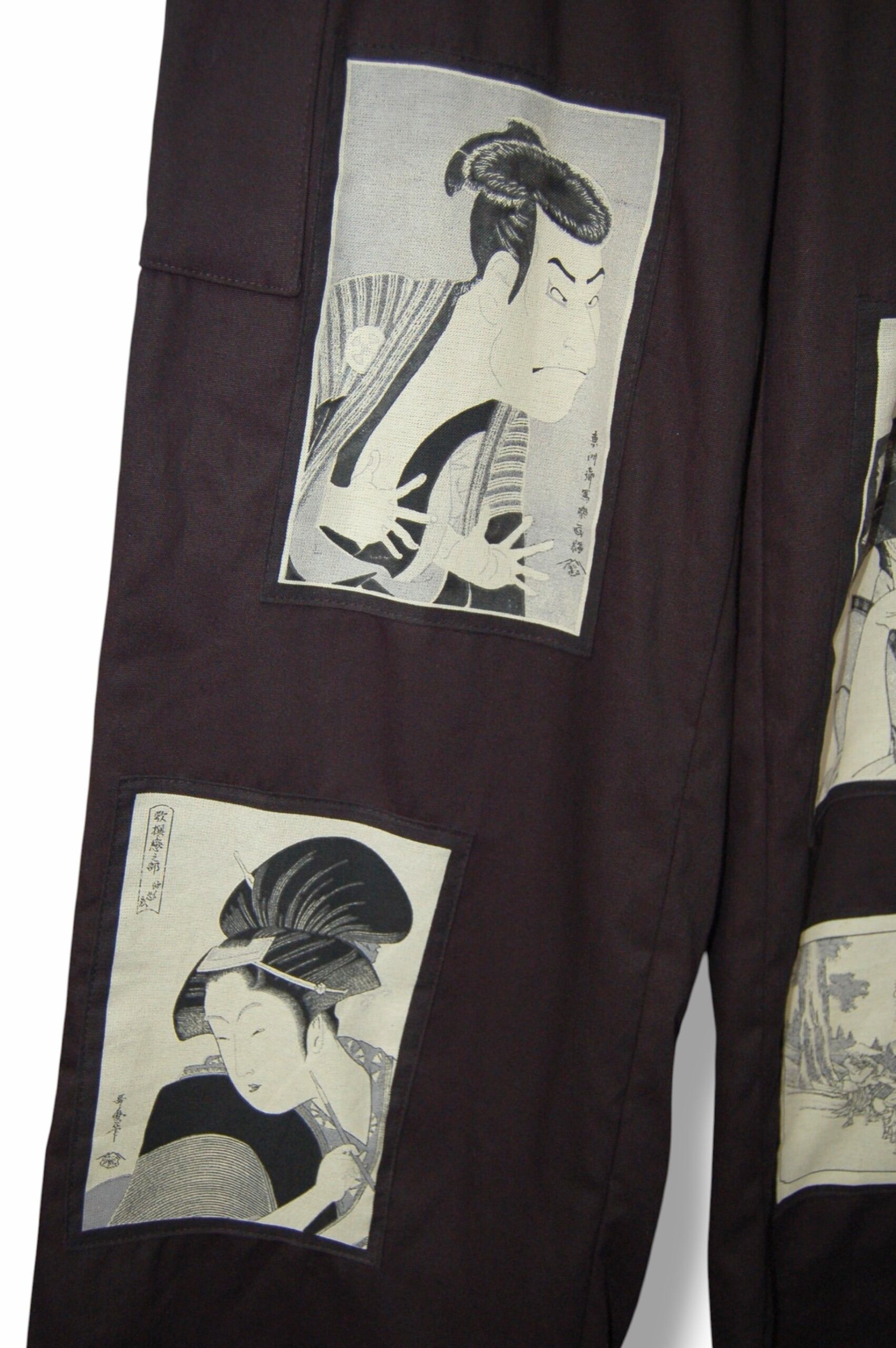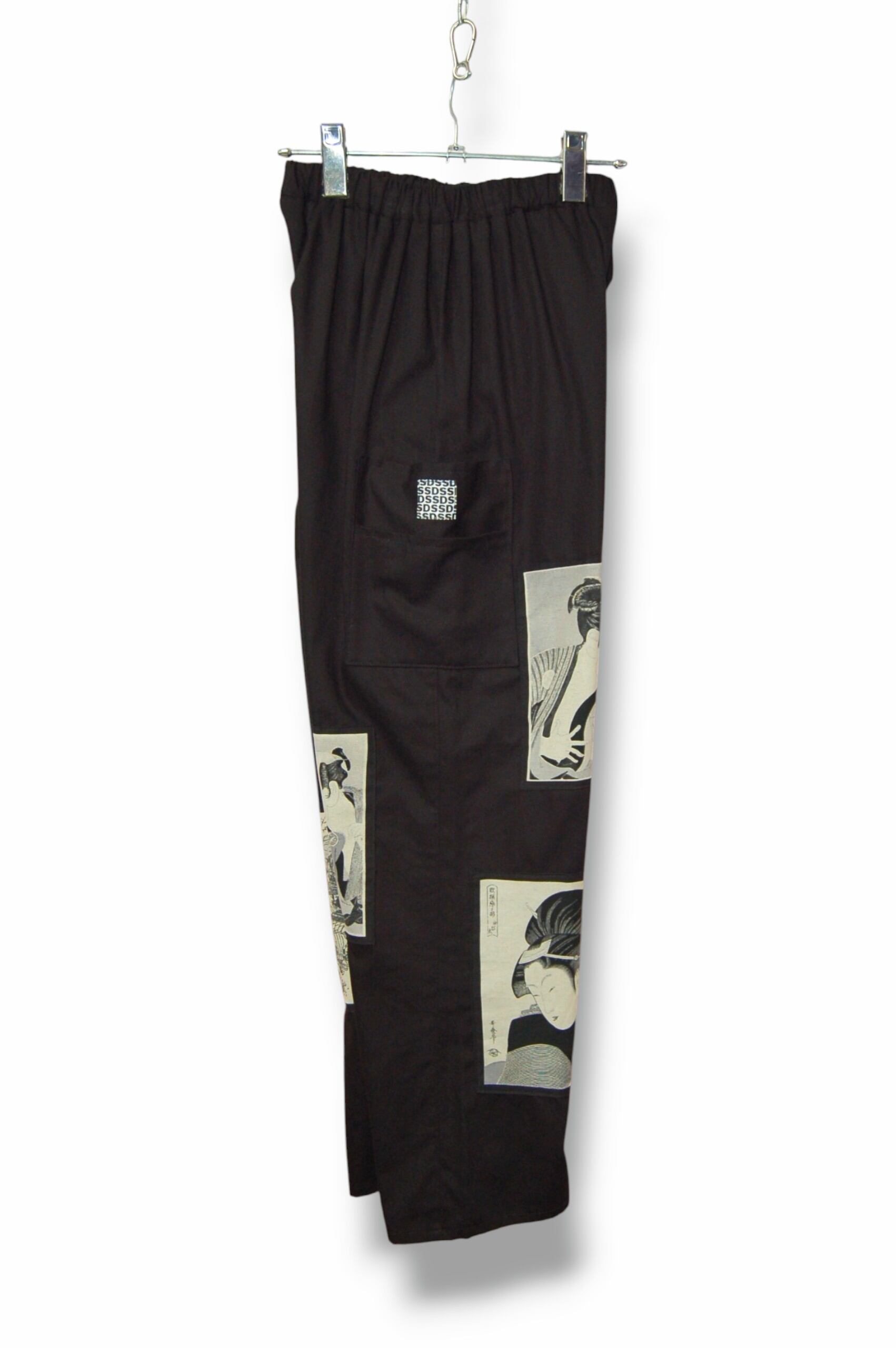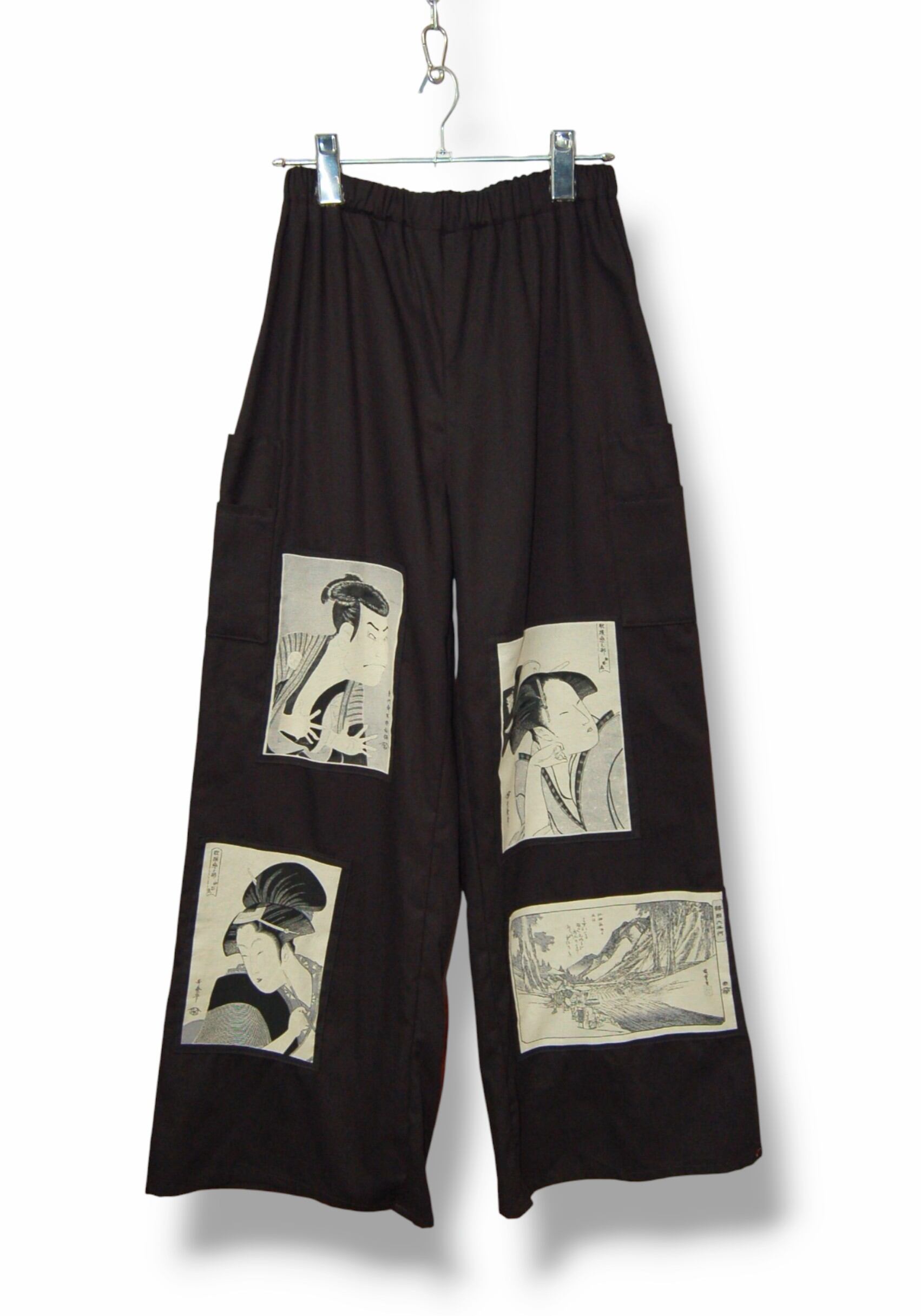 ブラックのワイドパンツベースに浮世絵デザインのパッチを合わせたコットンワイドパンツ。