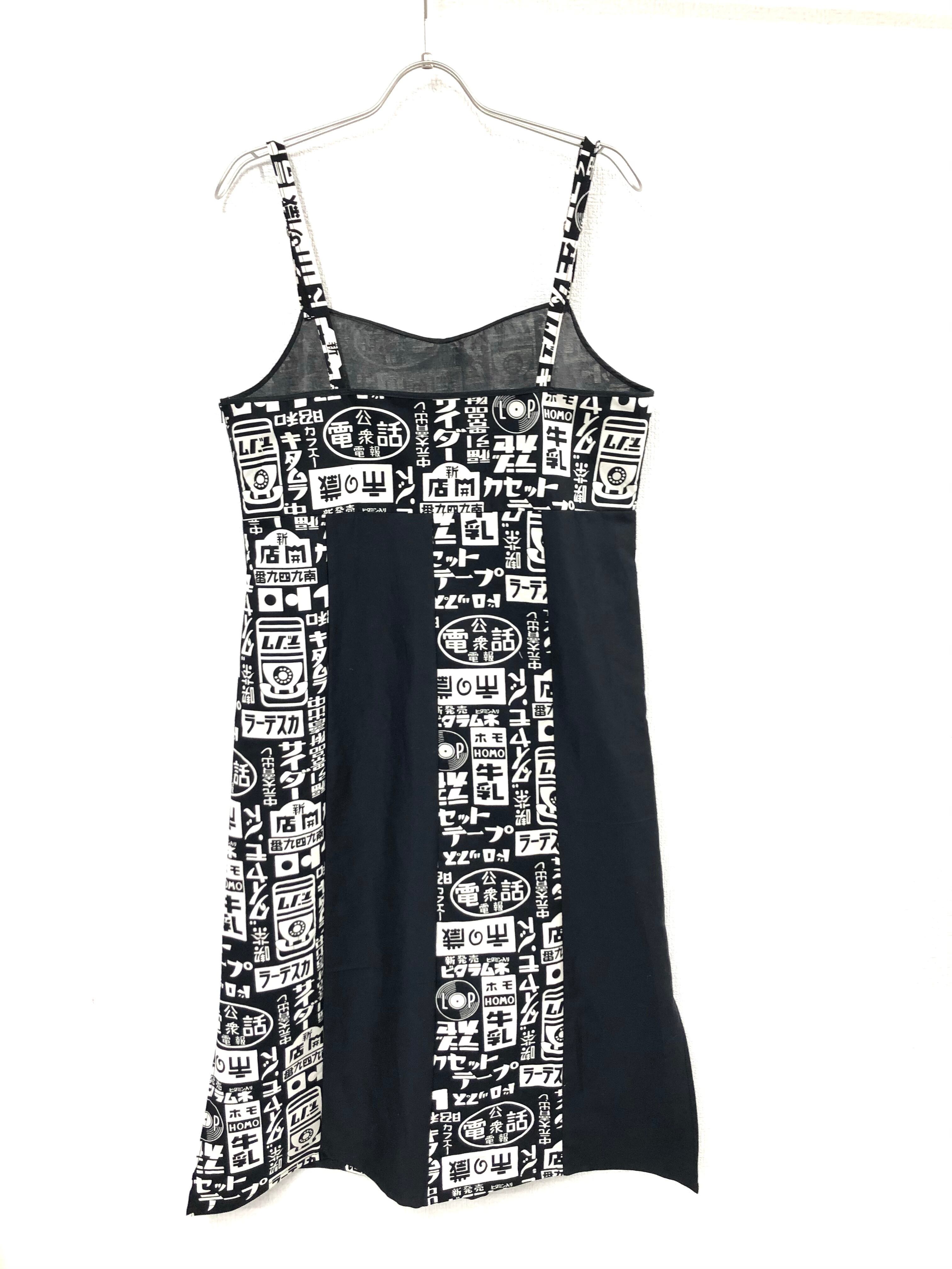 インパクトのあろレトロ看板ロゴデザイン生地とブラック生地をミックスしたロングスリットキャミソールワンピース。