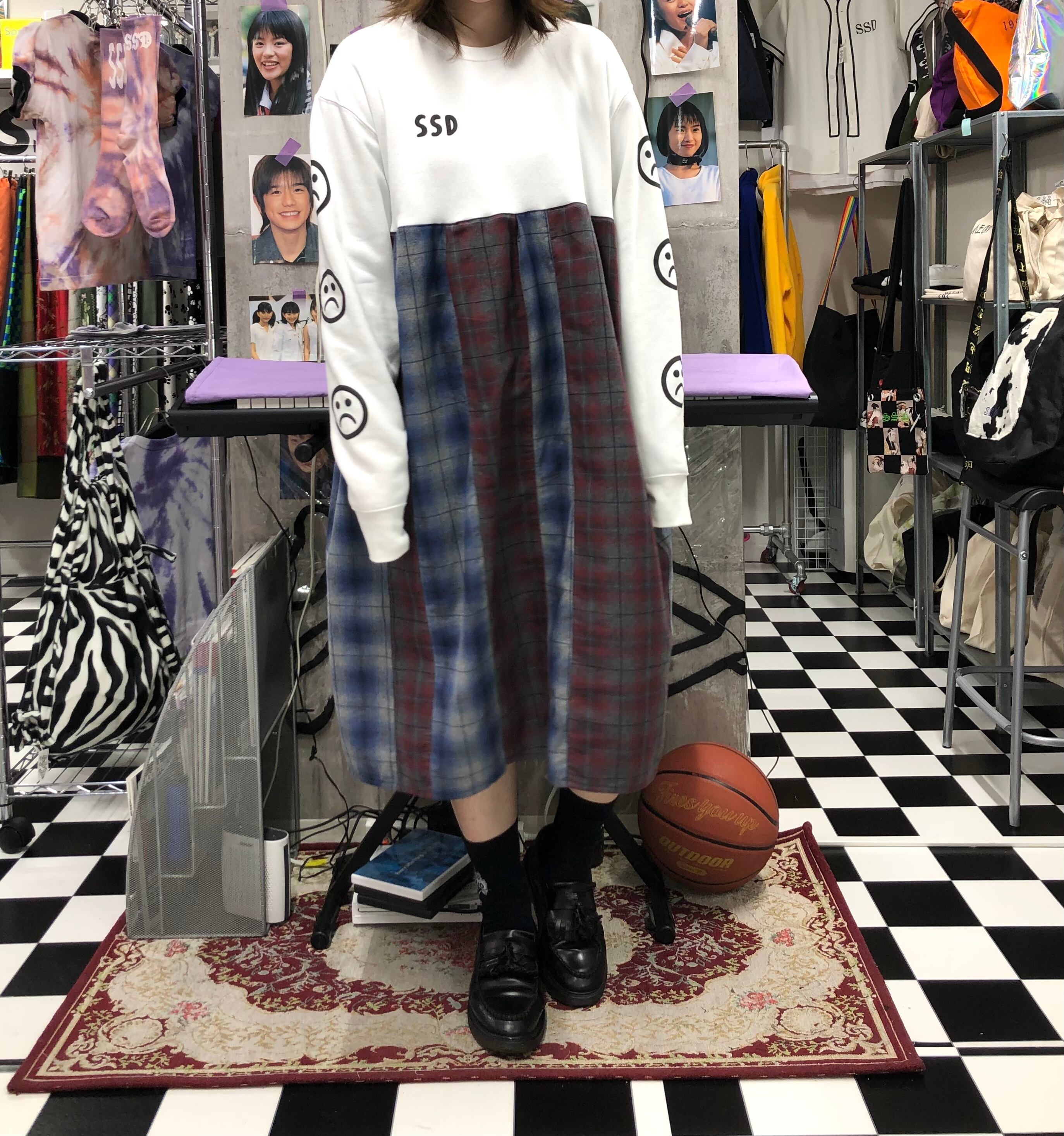 sad smileデザインスウェットとチェック生地を合わせたリメイクワンピース。