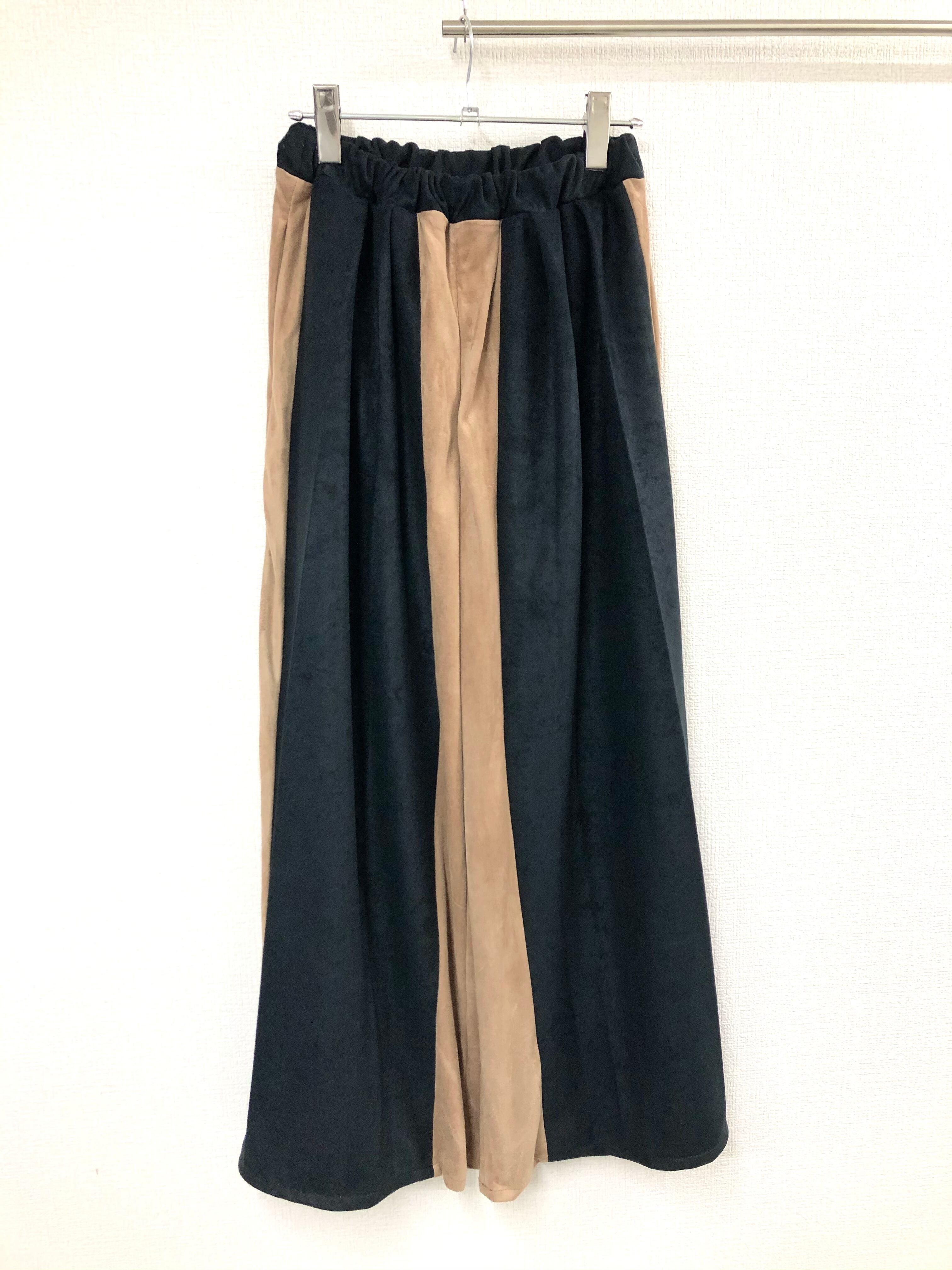 ベージュ×ブラックの生地を合わせたスエード プリーツワイドパンツ。