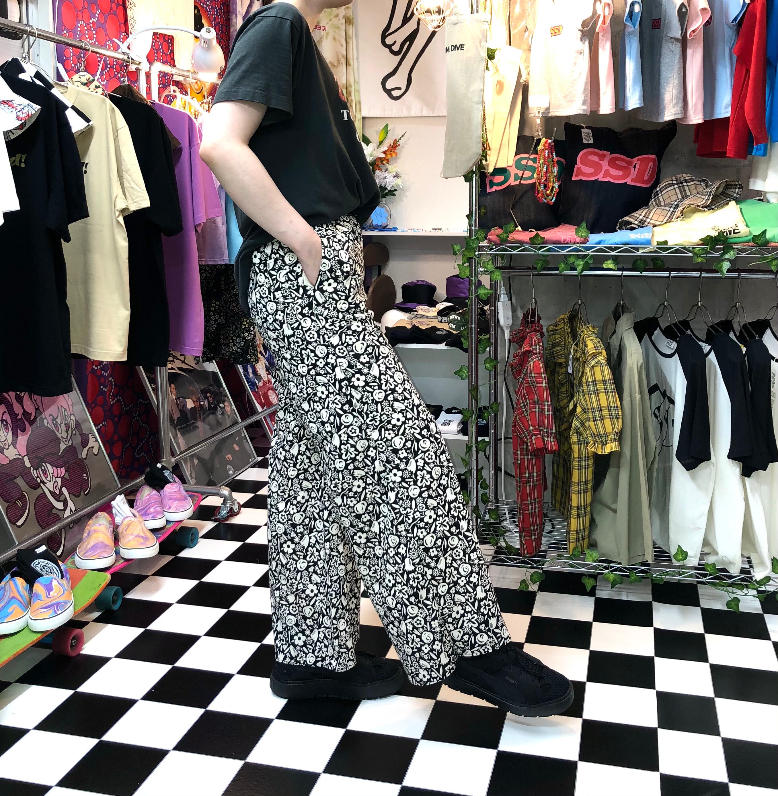 モノトーン 花柄 フロントジッパー ハイウエスト タックパンツ。