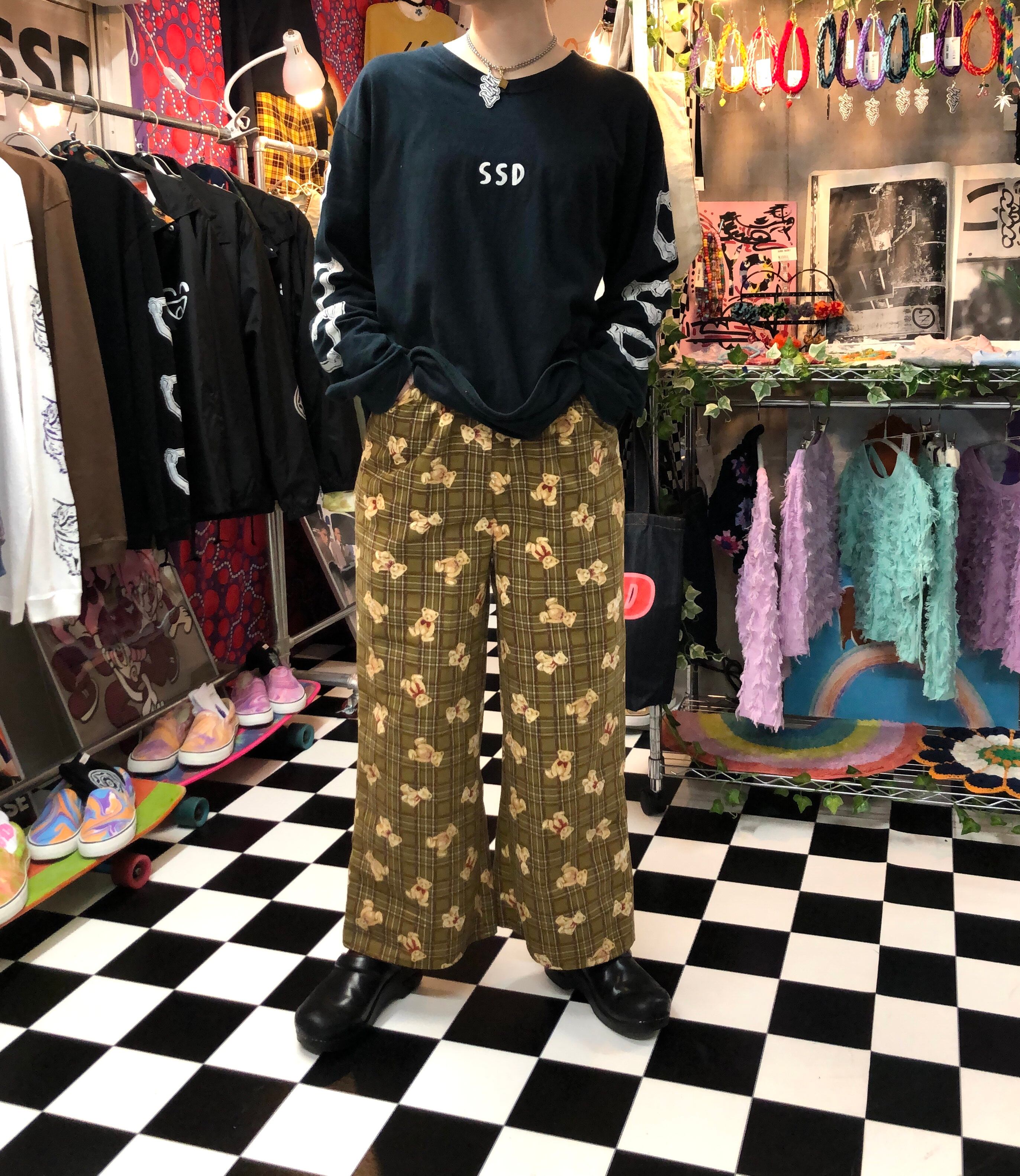 タータンチェック テディベア デザイン コーデュロイワイドパンツ。