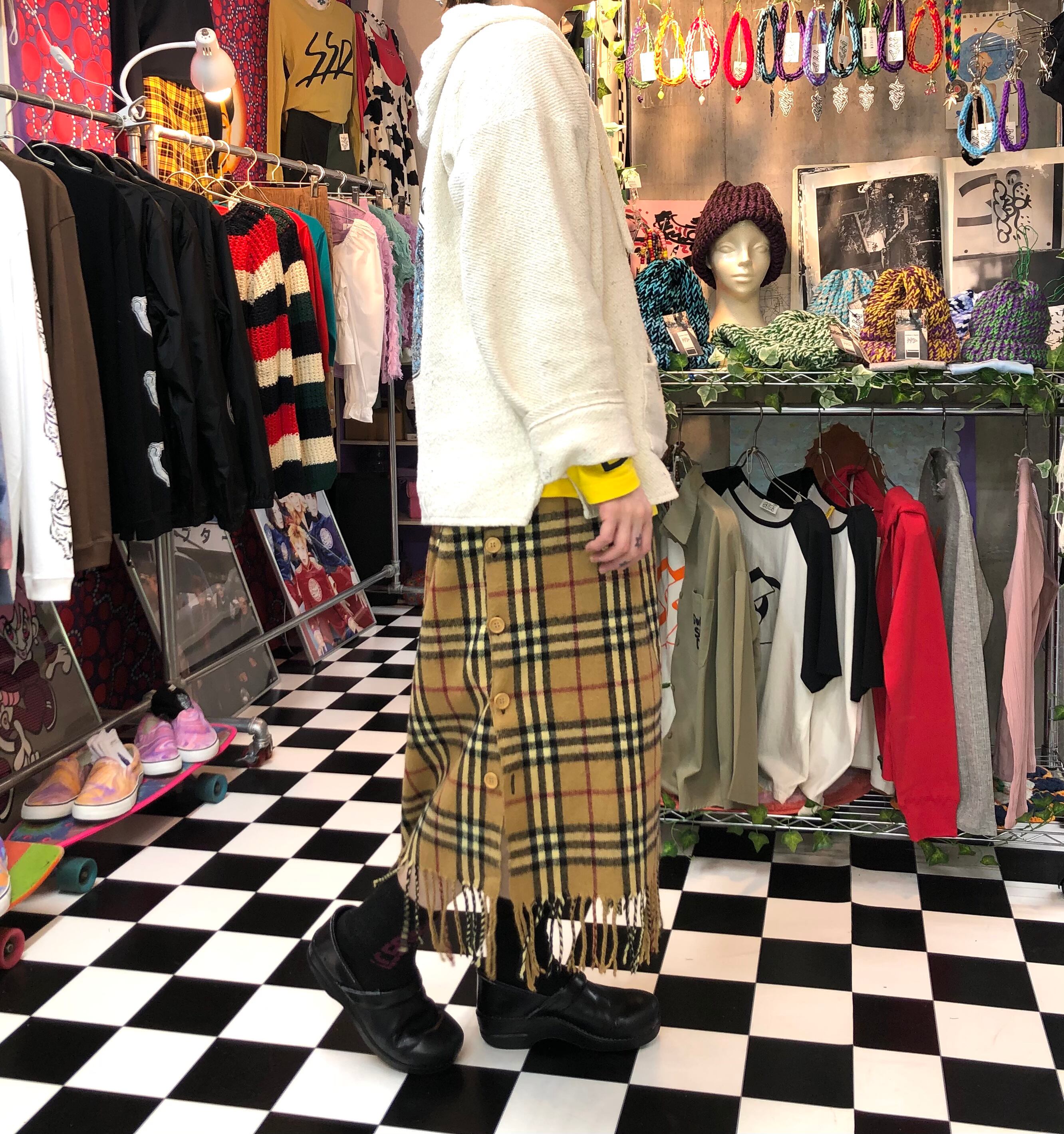リメイク タータンチェック ボタンスリット フリンジロングスカート。