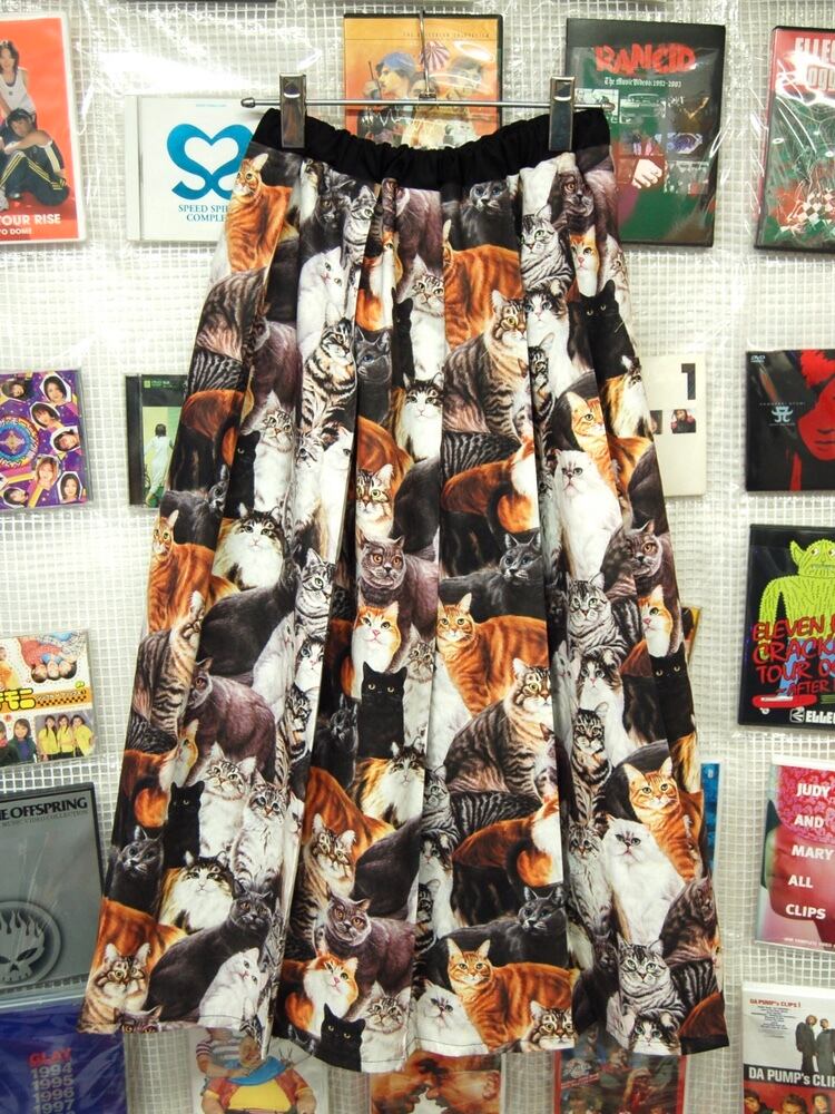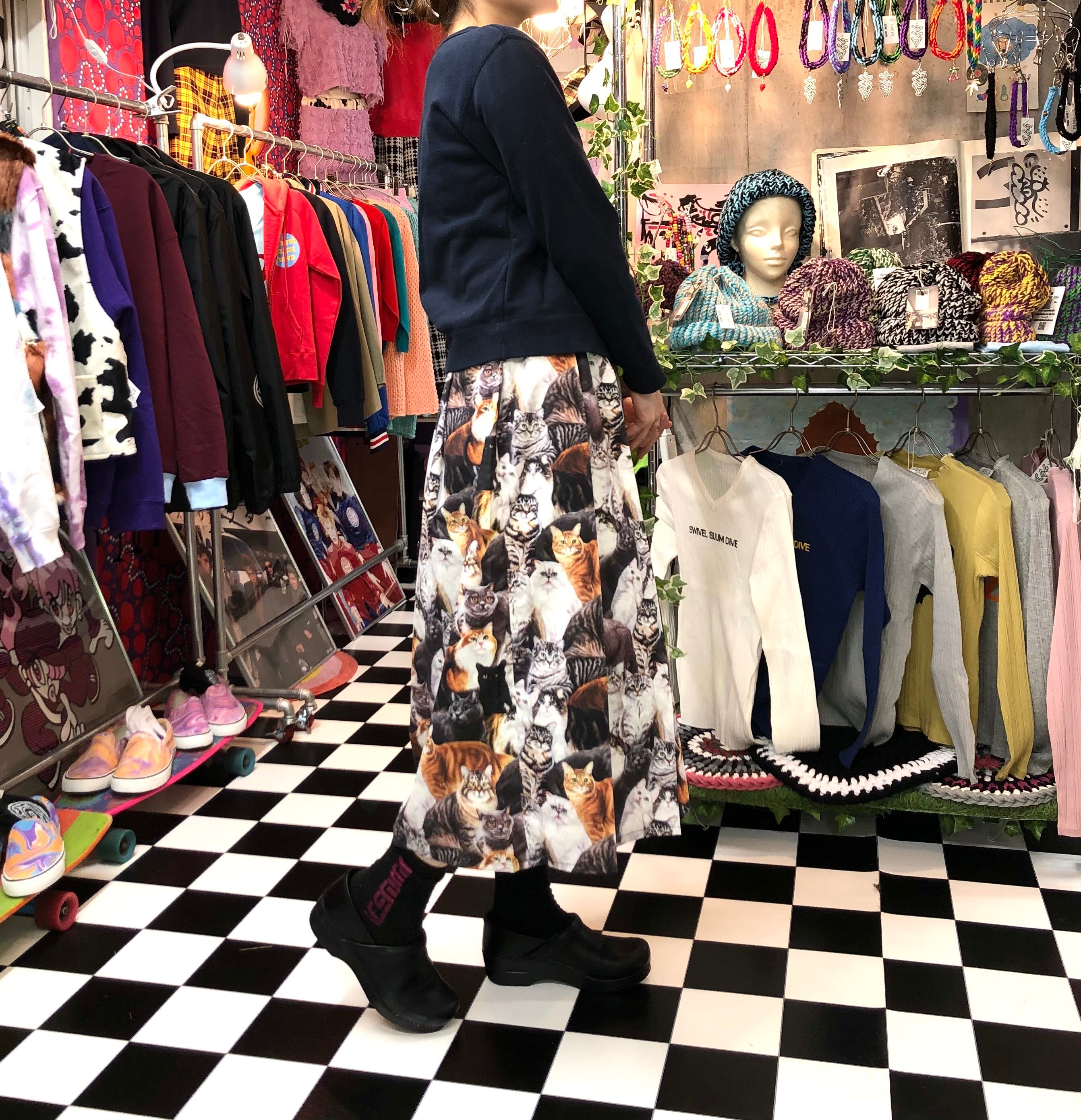 猫柄 リアルプリント 裏地付き フレアプリーツロングスカート