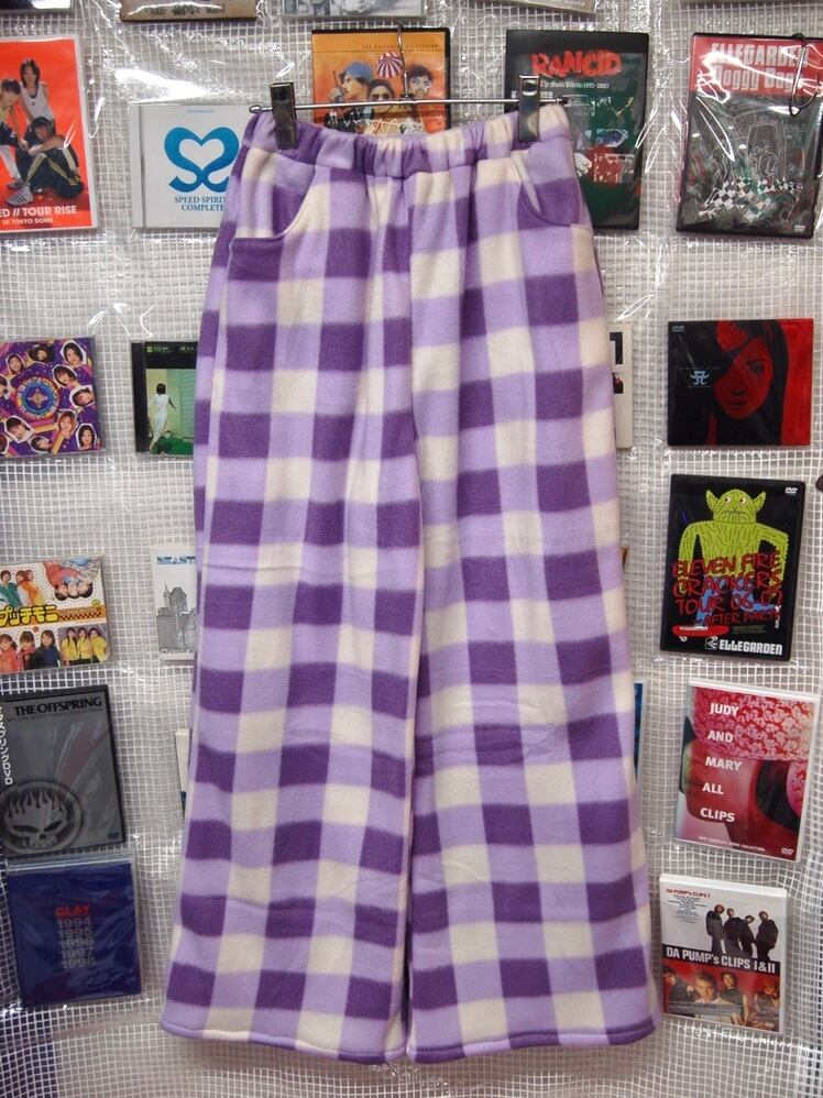 パープル×ホワイト チェック柄あったかフリースワイドパンツ。