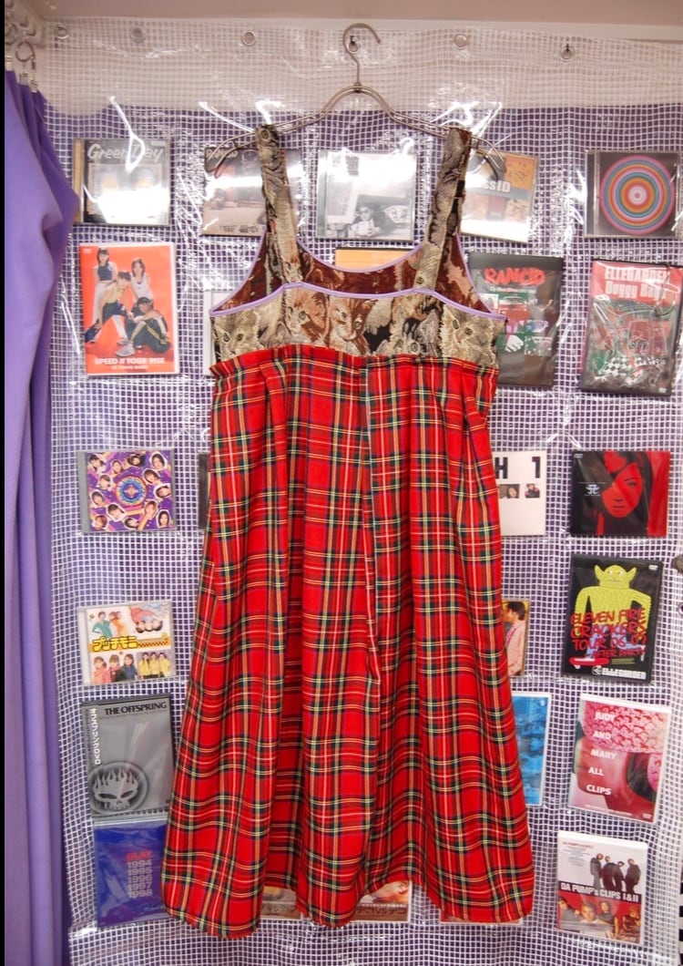 猫柄ゴブラン織生地とタータンチェックフレアロングワンピース。