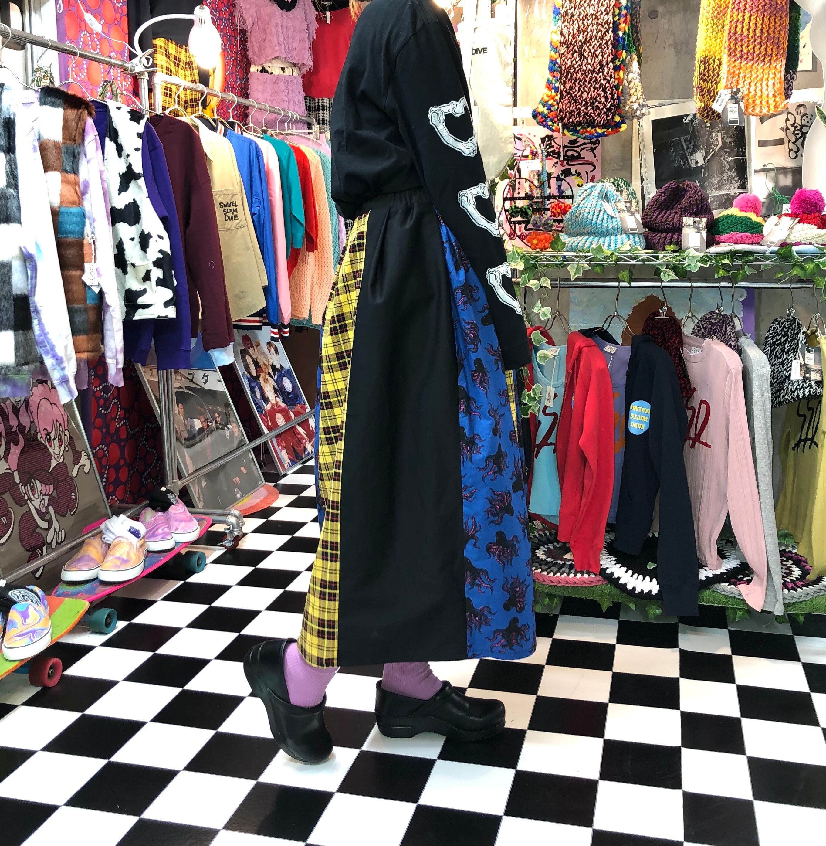 前後関係なく着用する角度によってデザインが変わって見えるインパクトデザインのミックスデザインロングスカート。