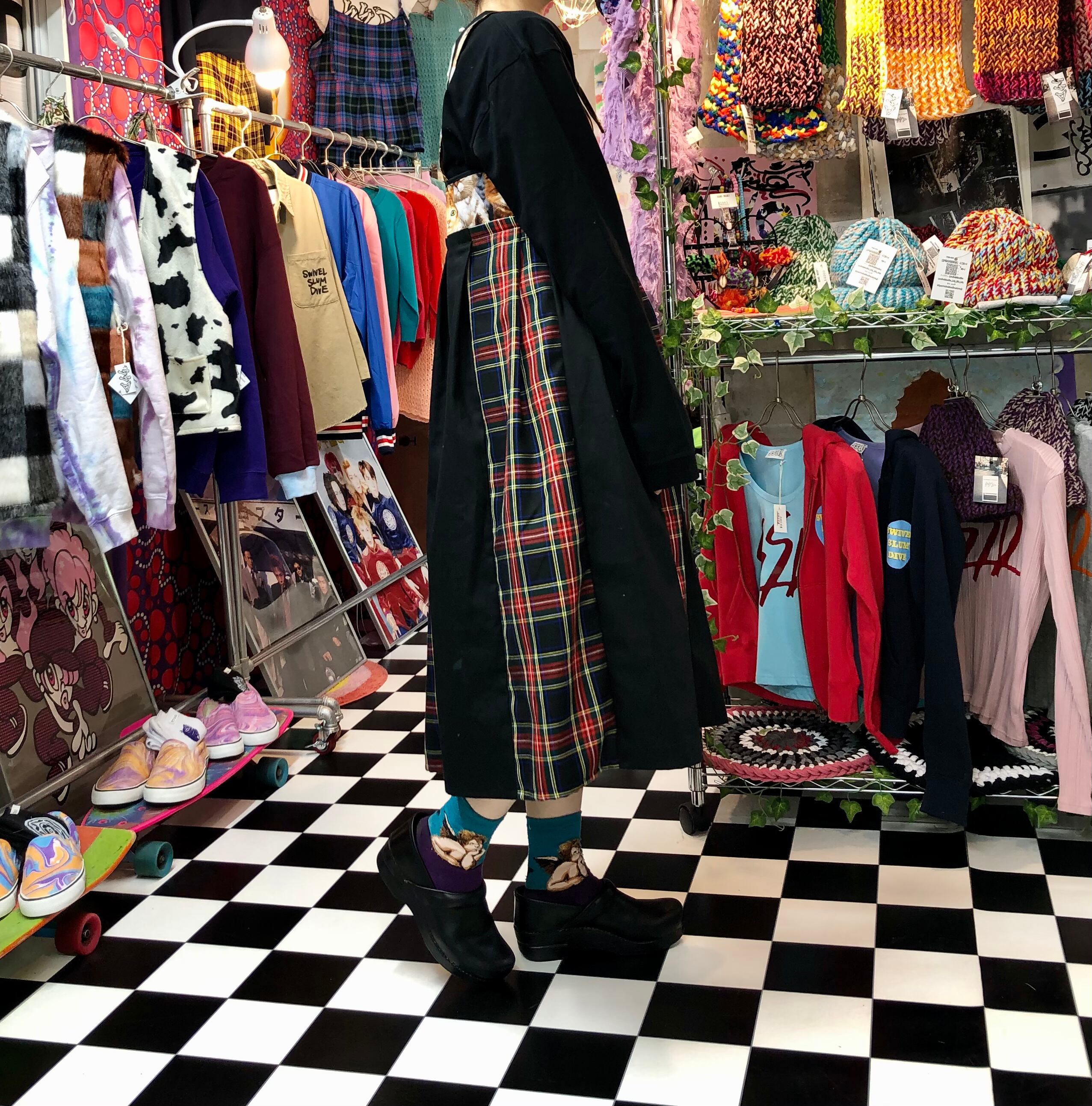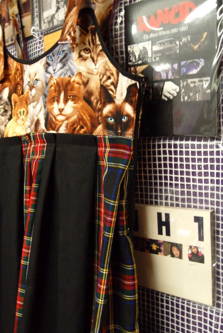 リアル猫柄生地とタータンチェック×ブラック ミックスフレアロングワンピース。
