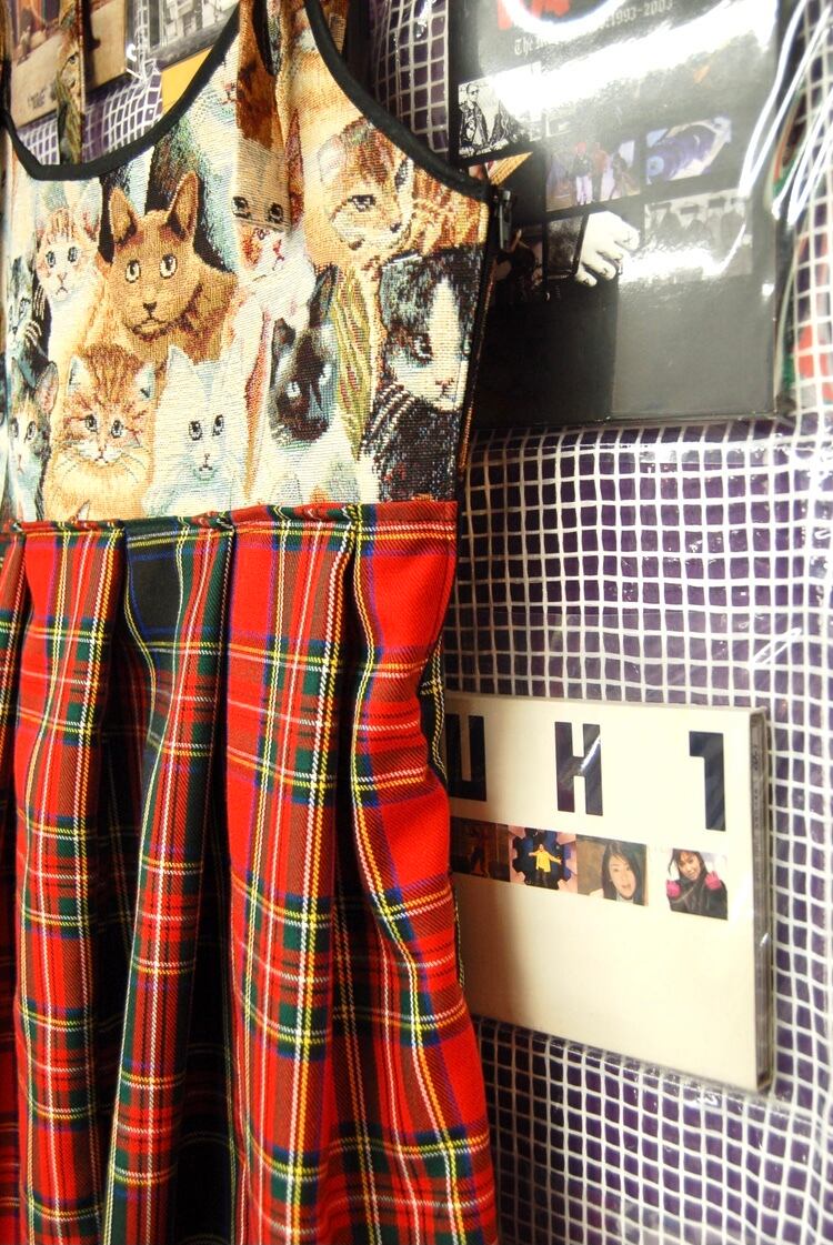 猫柄ゴブラン織生地とタータンチェックミックスフレアロングワンピース。