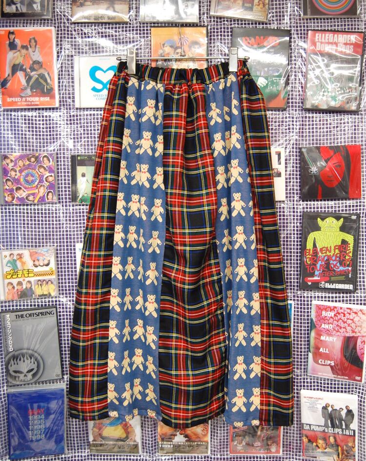 伸縮性のあるジャガードニット生地のテディベアデザインとタータンチェックのミックスフレアロングスカート。