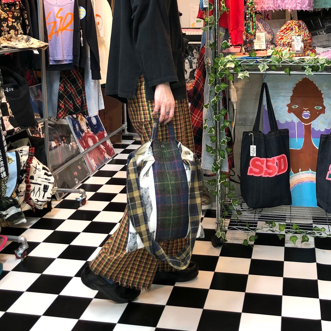 ベア×タータンチェック コットンツイード地 ショルダートートバッグ