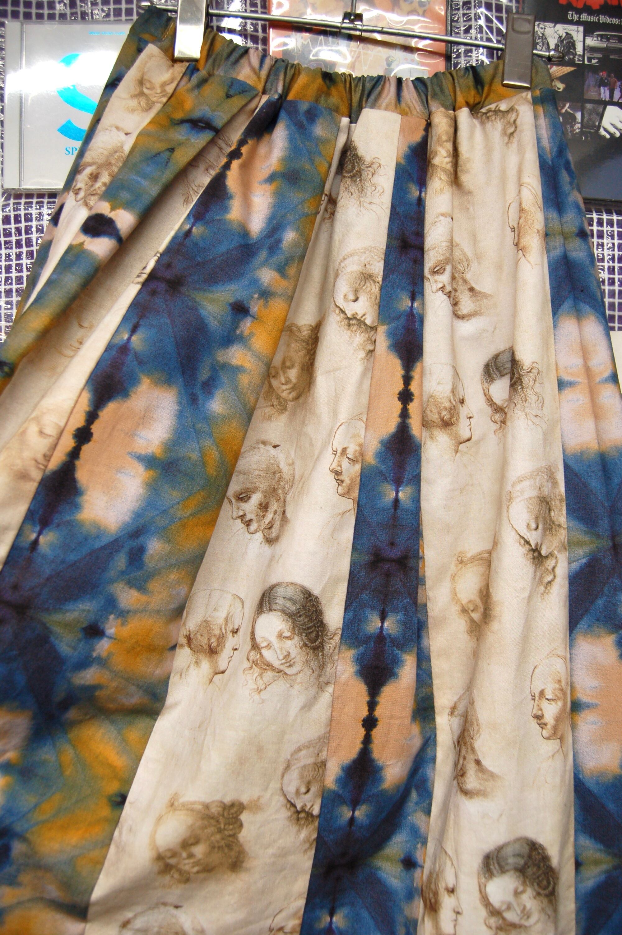 ダヴィンチデッサンデザインとアートなグラフィック生地をミックスしたフレアプリーツロングスカート。