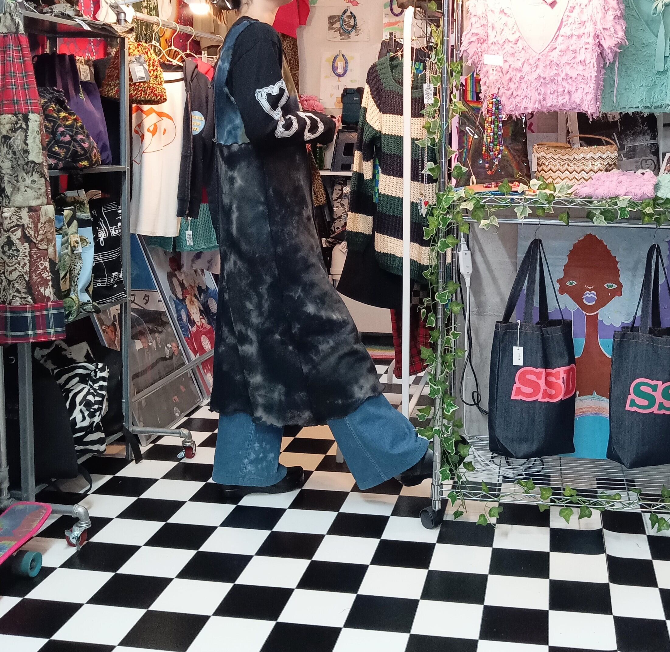 ハンドメイドのムラ染めプリント生地をミックスした他にない一点。