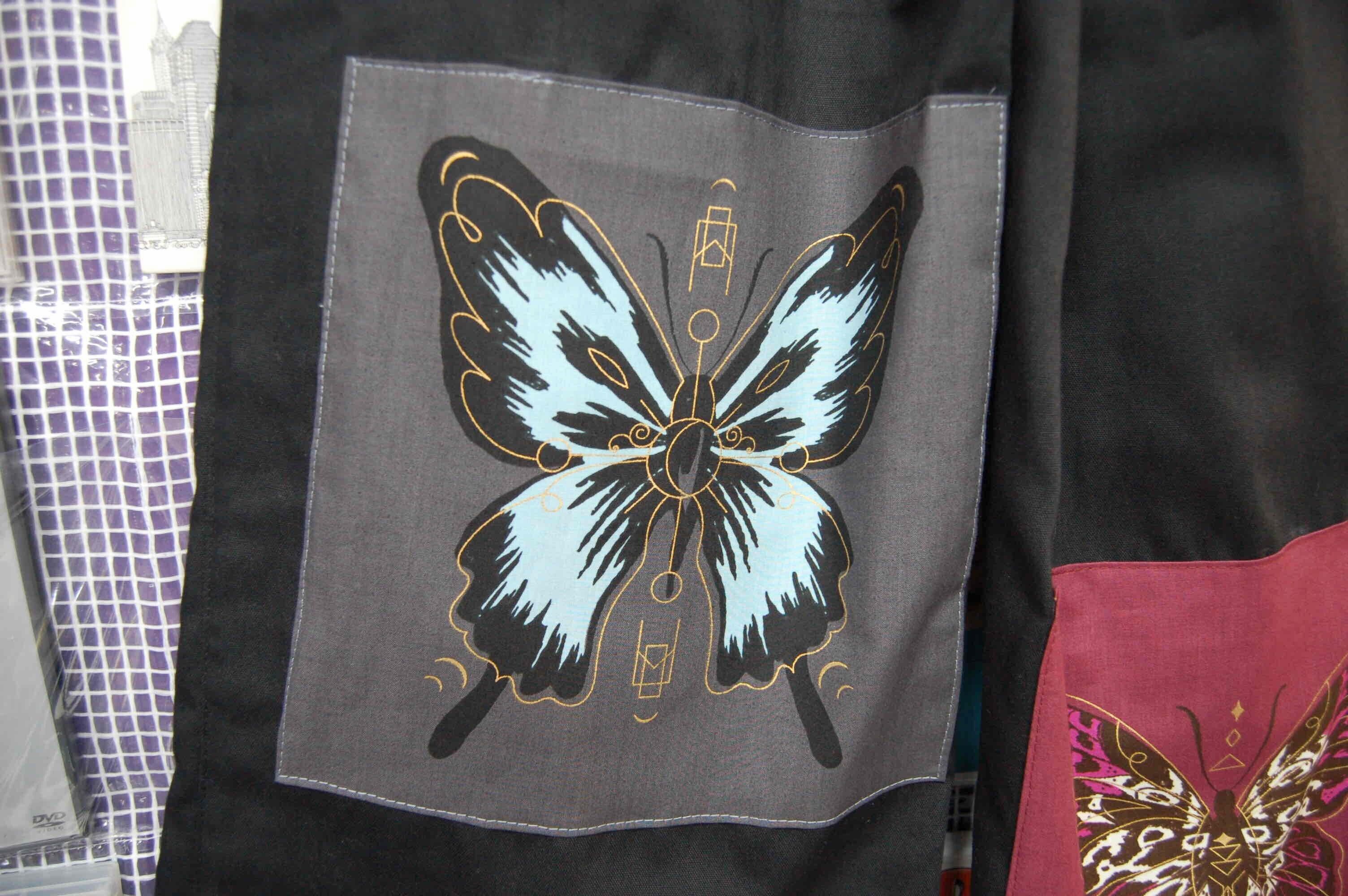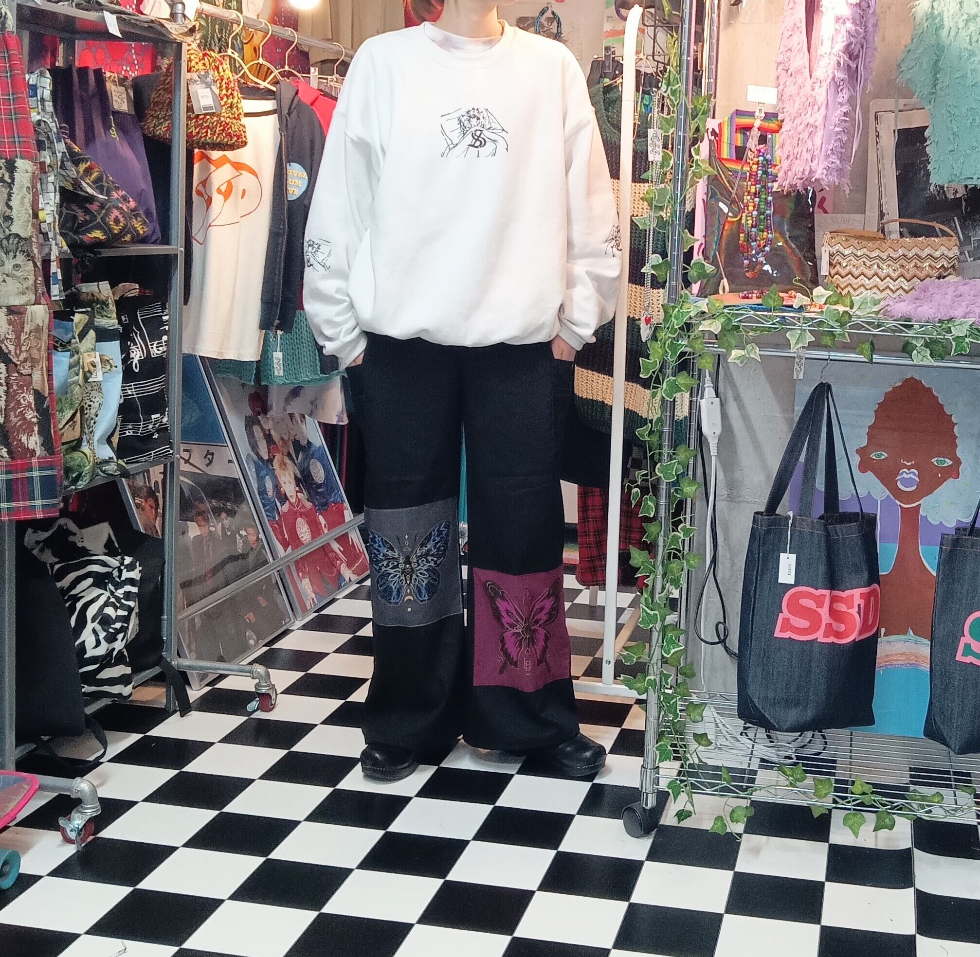 ブラックのワイドパンツベースに蝶々デザインのパッチを合わせたオリジナルワイドパンツ。