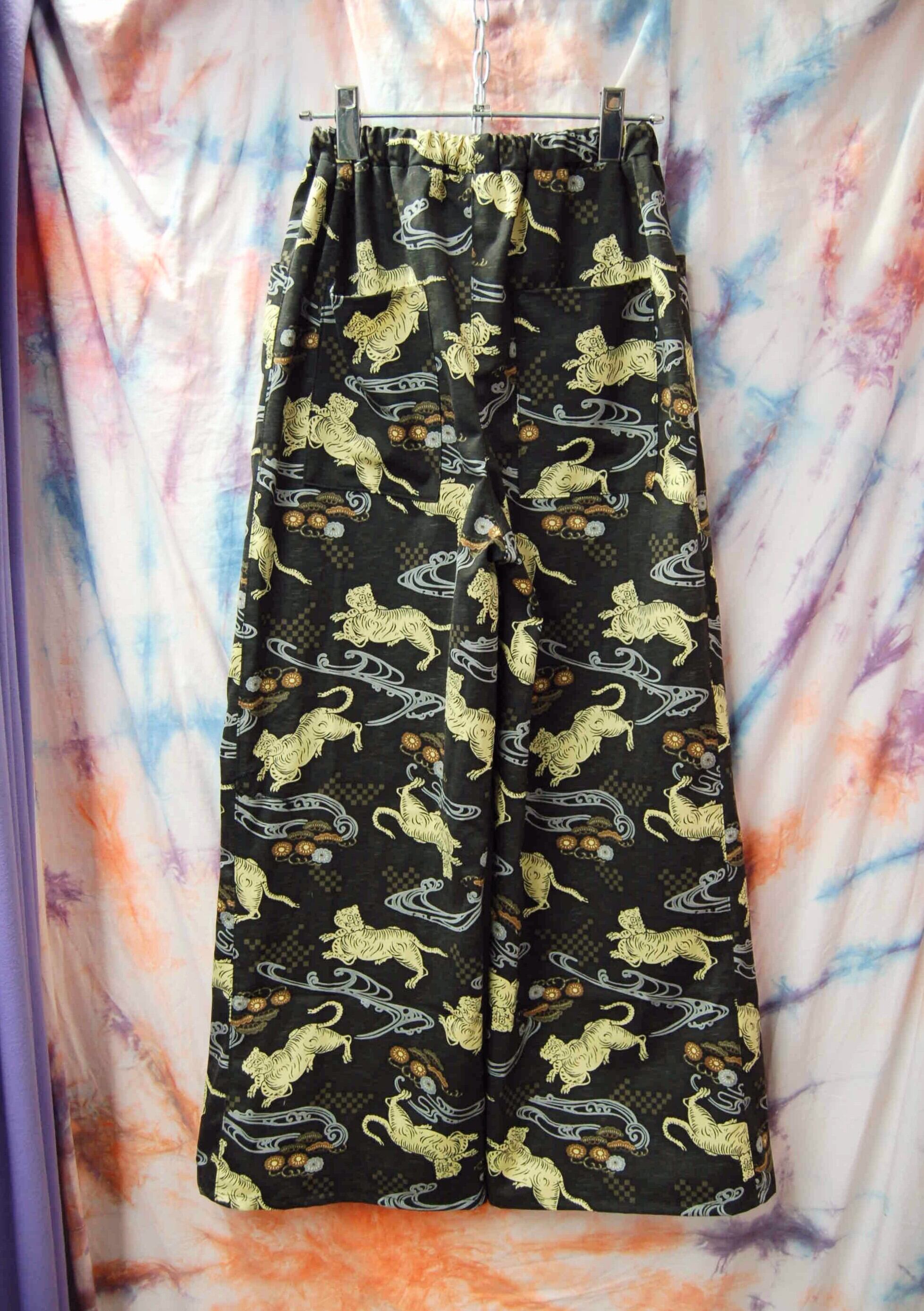 和柄×ワイドシルエットの大胆な組み合わせが目を引く、虎の和柄コットンワイドパンツ。黒い生地にプリントされた虎の図柄が、どこかエキゾチックでカッコいい雰囲気を醸し出しています。