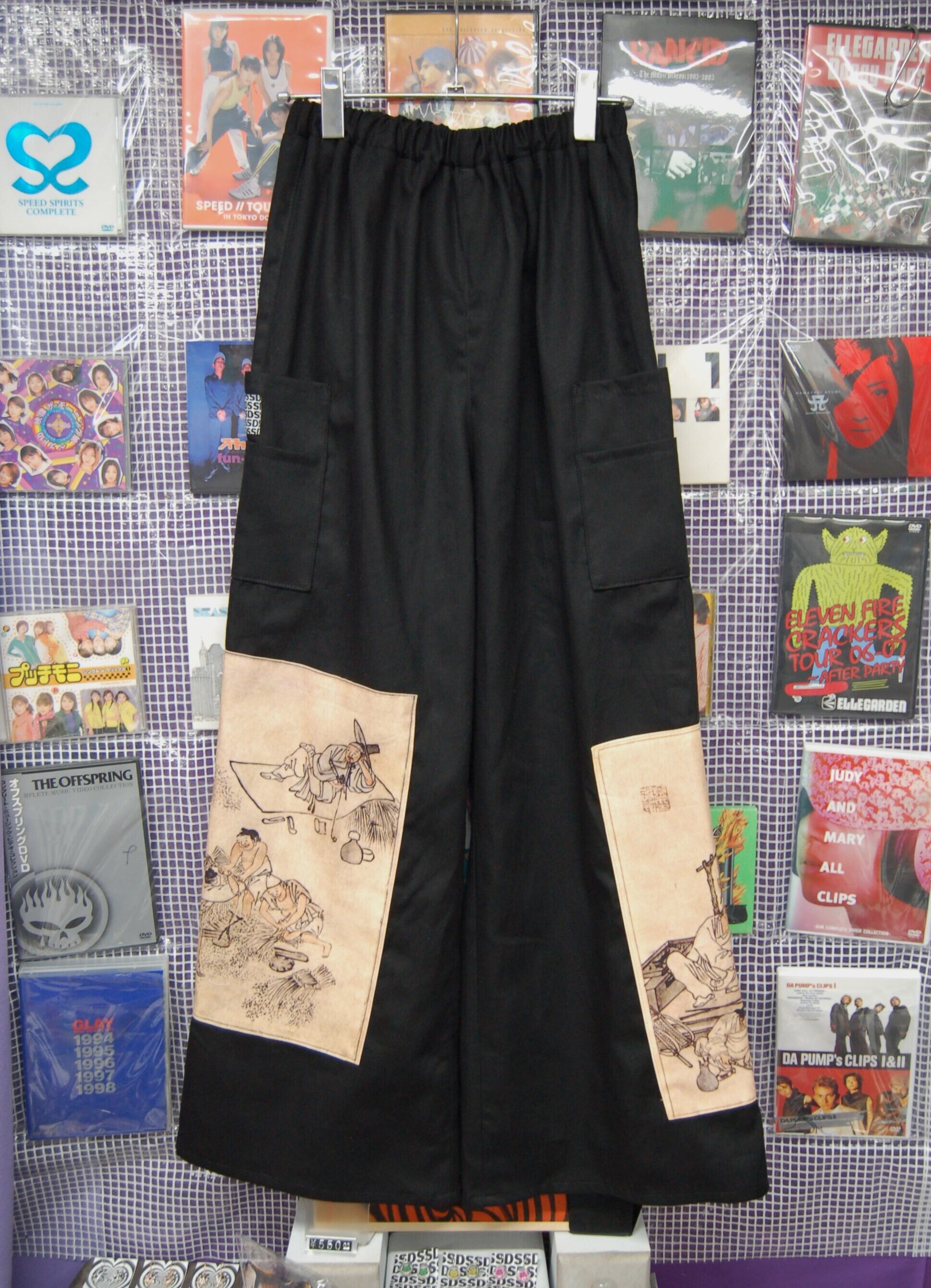 ブラックのワイドパンツベースに風習画デザインのパッチを合わせたコットンワイドパンツ。