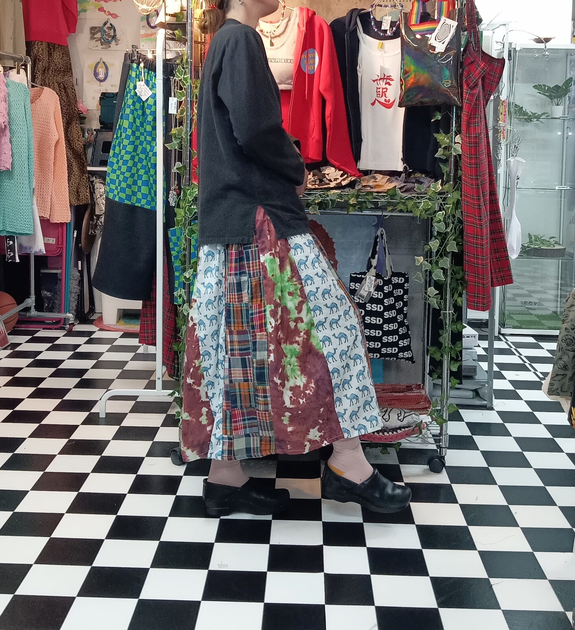 ラクダ×マドラスチェック×タイダイ柄ミックスデザイン フレアロングスカート。