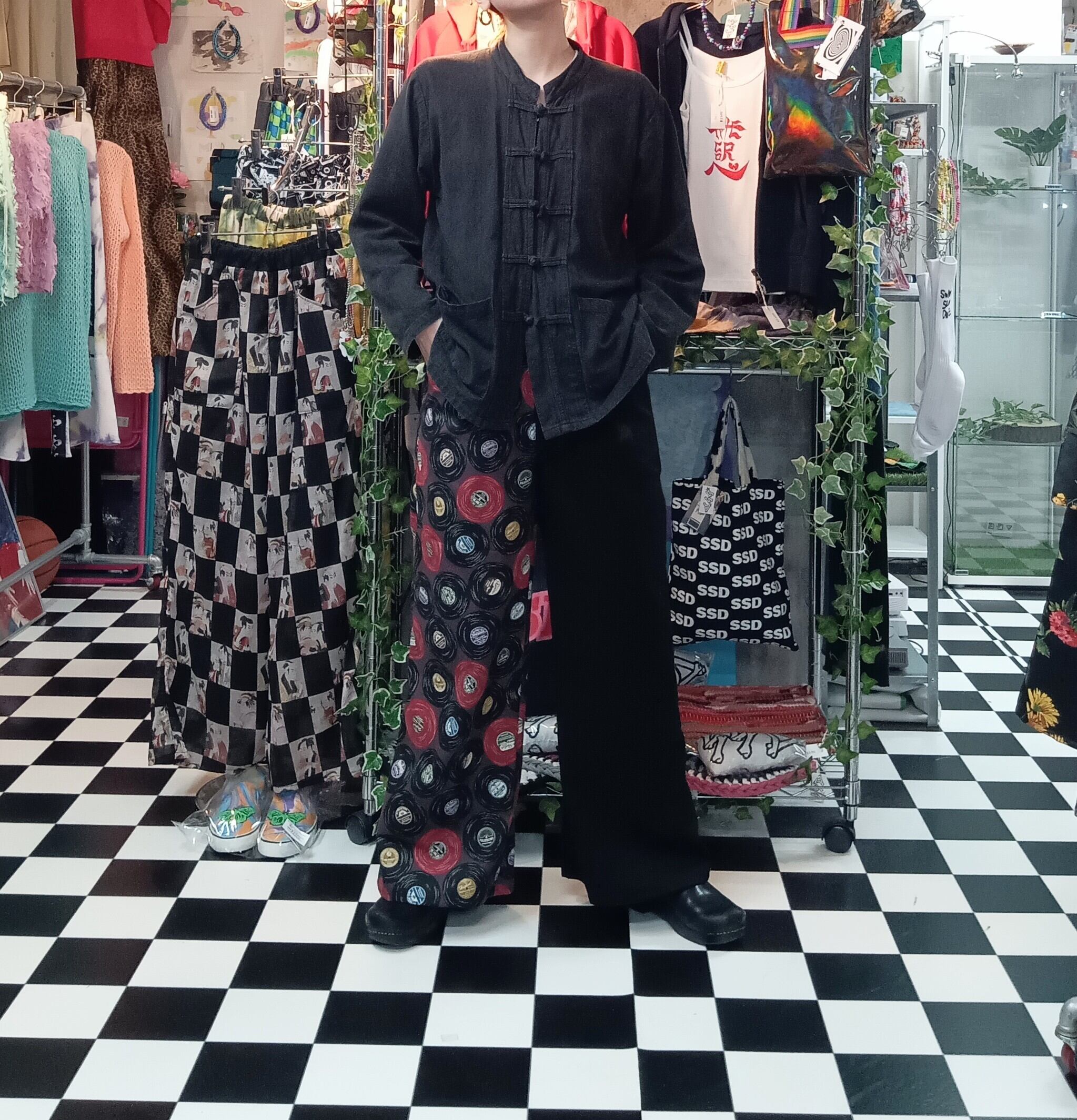 レコード柄×ブラック ミックス コットンワイドパンツ