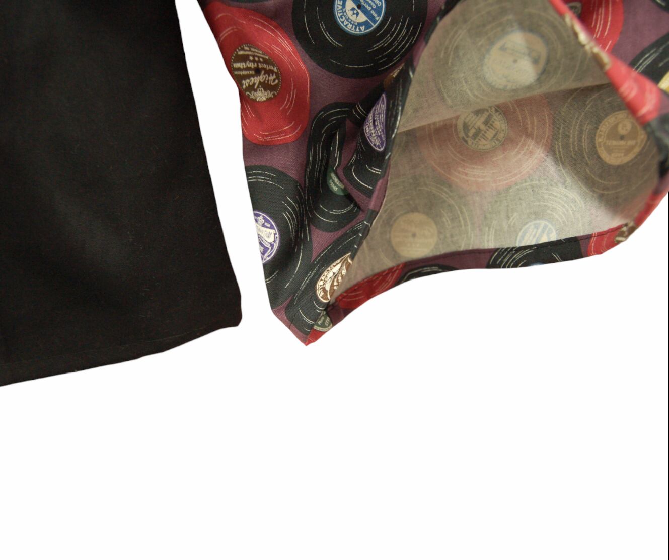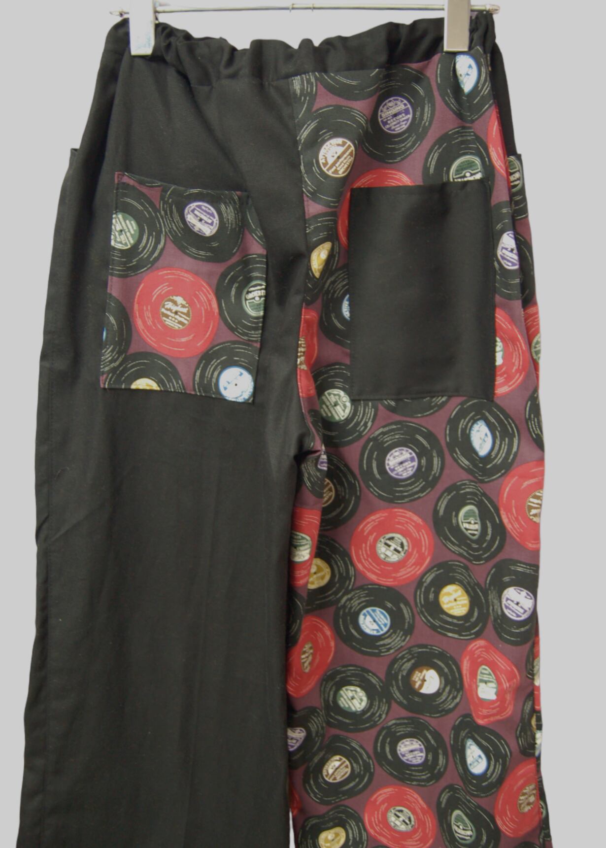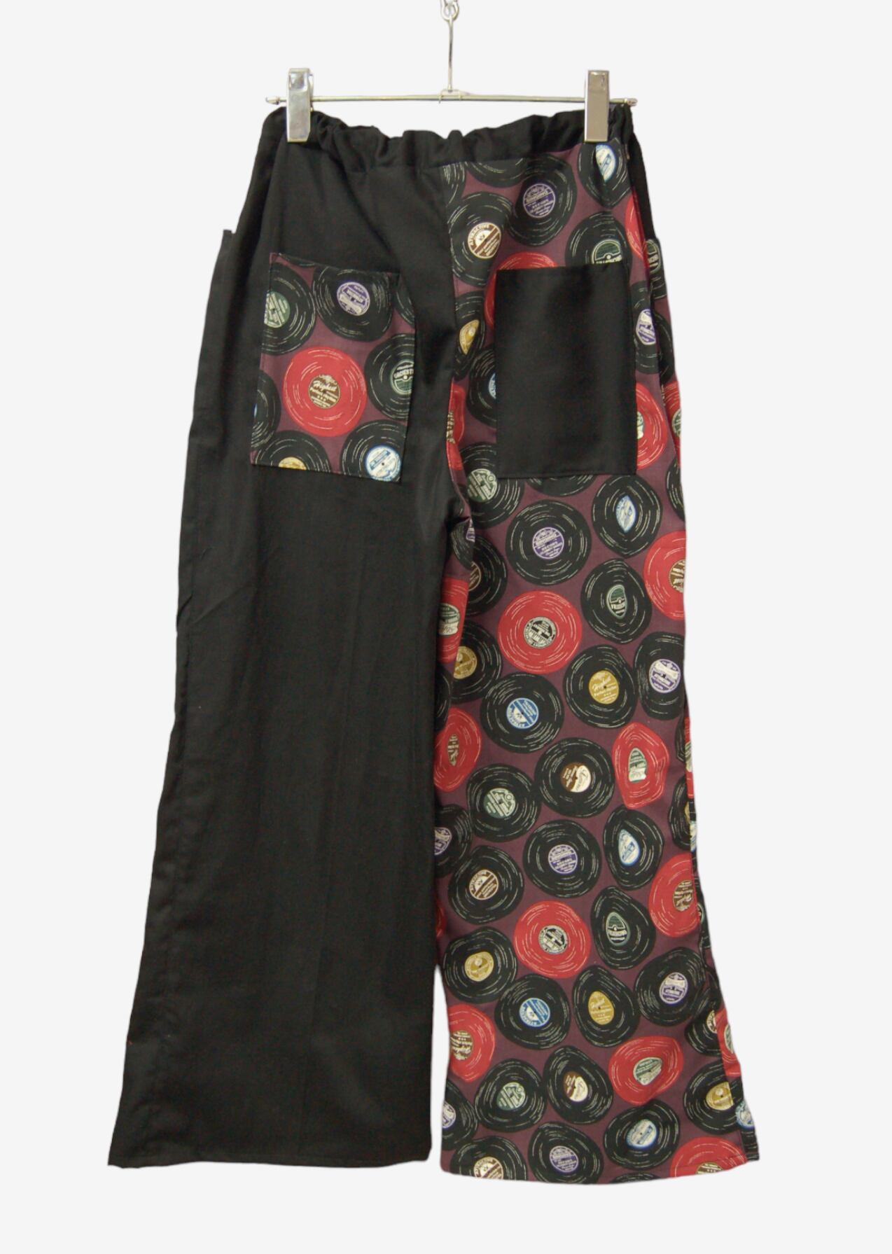 パープルベースのレコード柄とブラック生地を合わせたコットンワイドパンツ。