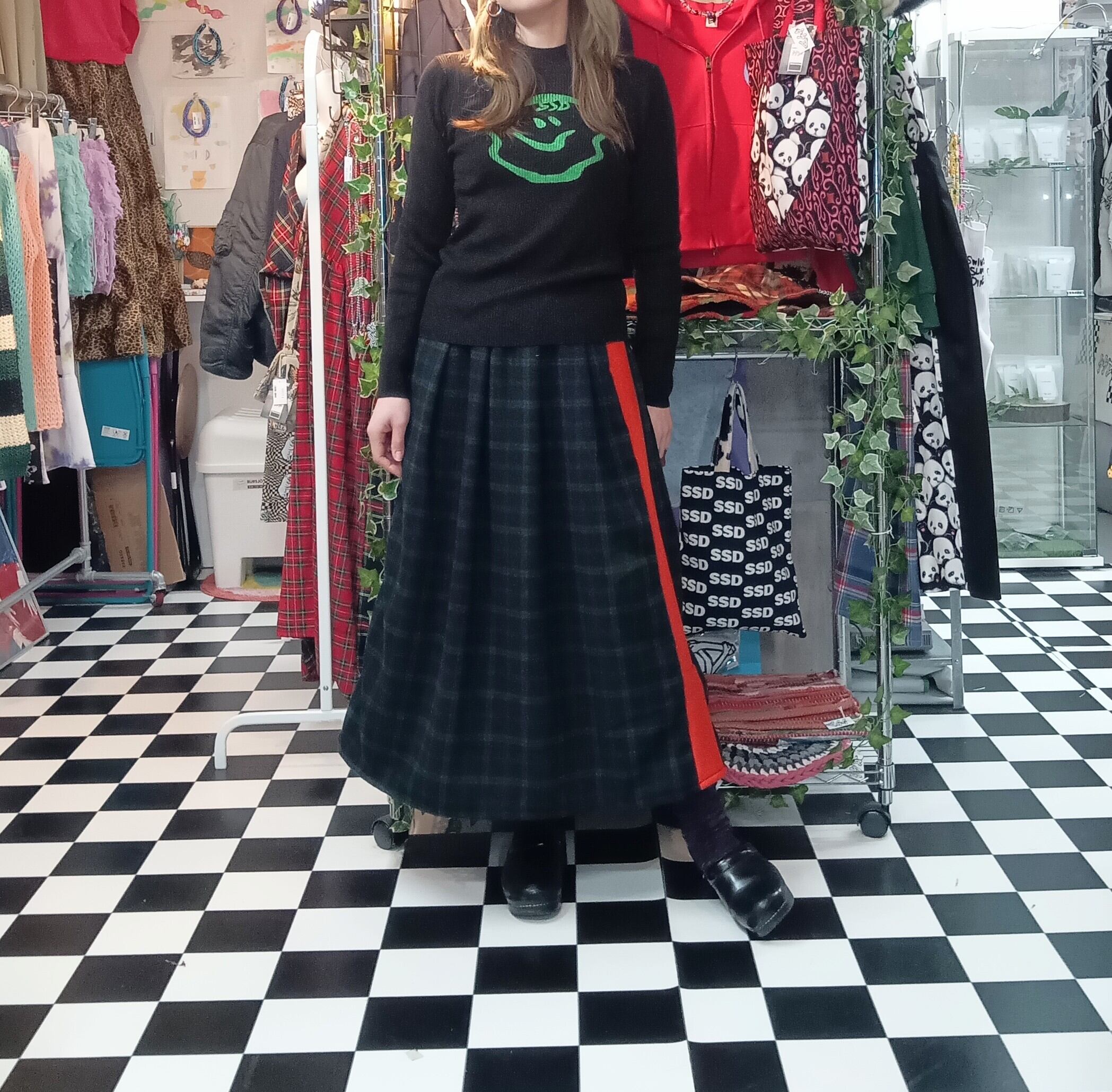 ブラックウォッチとサイドオレンジラインが相性の良いフレアロングスカート。