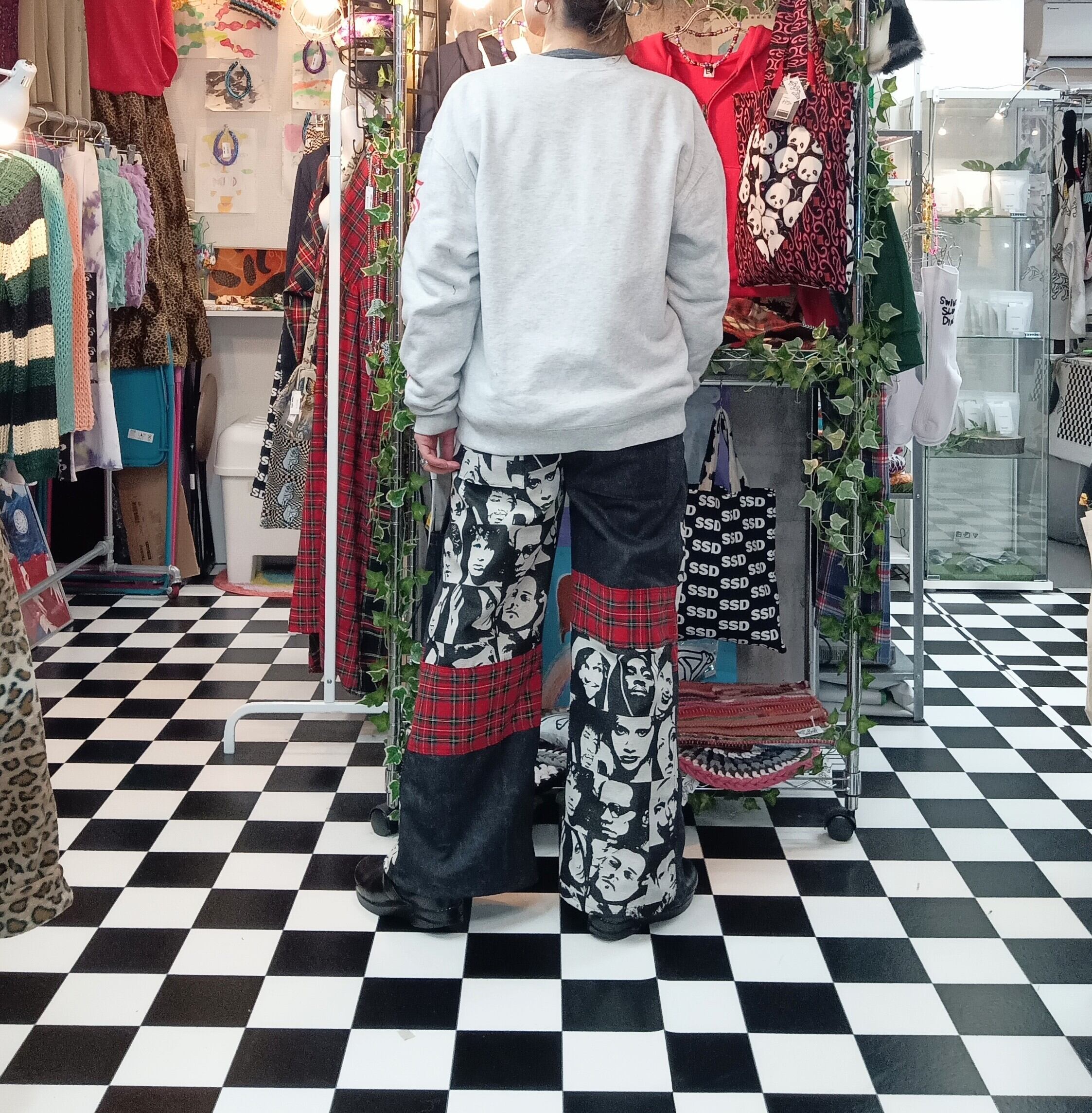 ゴブラン織り海外スターデザイン×ブラックウォッシュデニム×タータンチェックを合わせた織りジャケットミックスワイドパンツ。