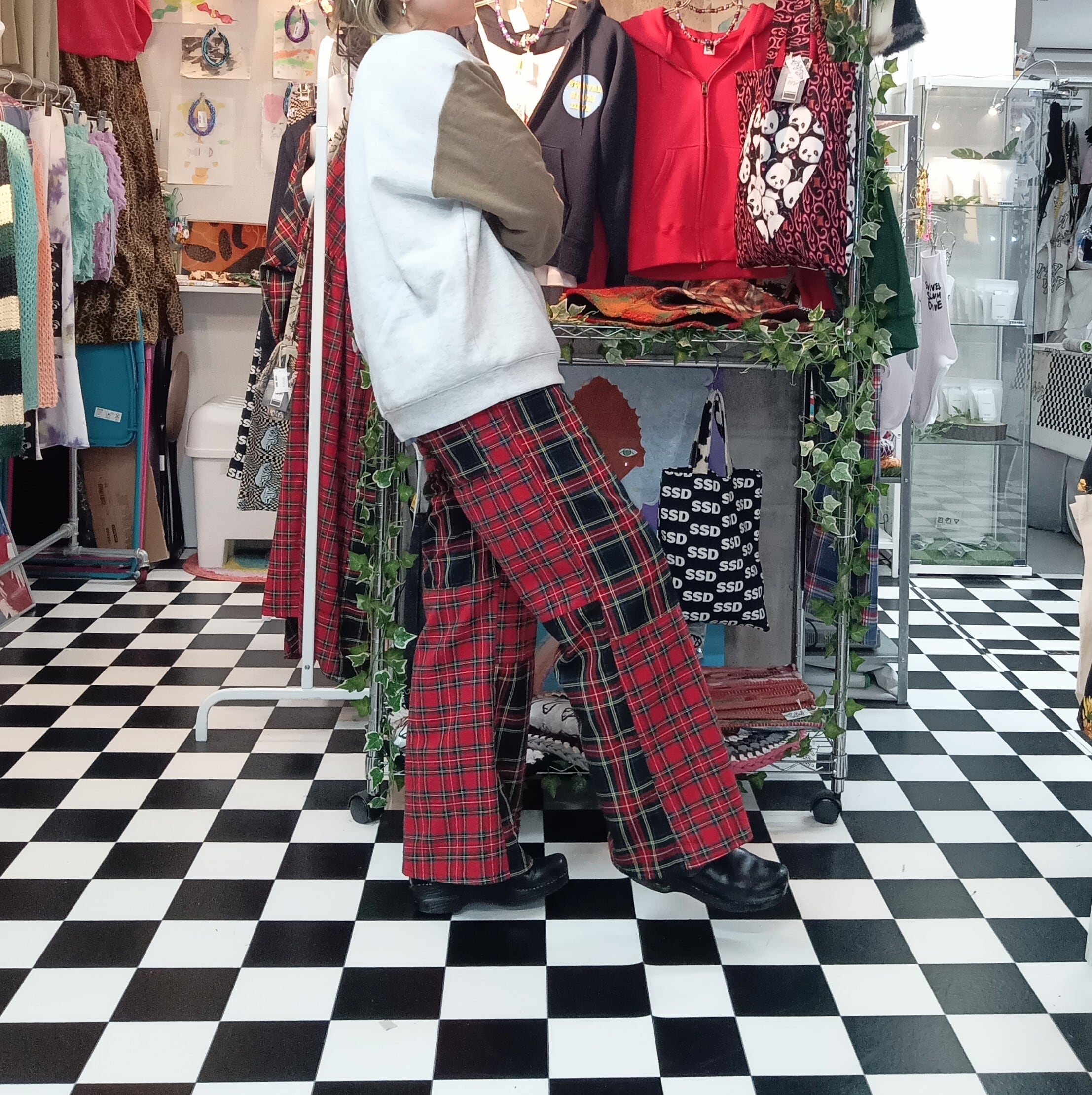 2カラーのタータンチェックを切り替え合わせたオリジナルミックスコットンワイドパンツ。
