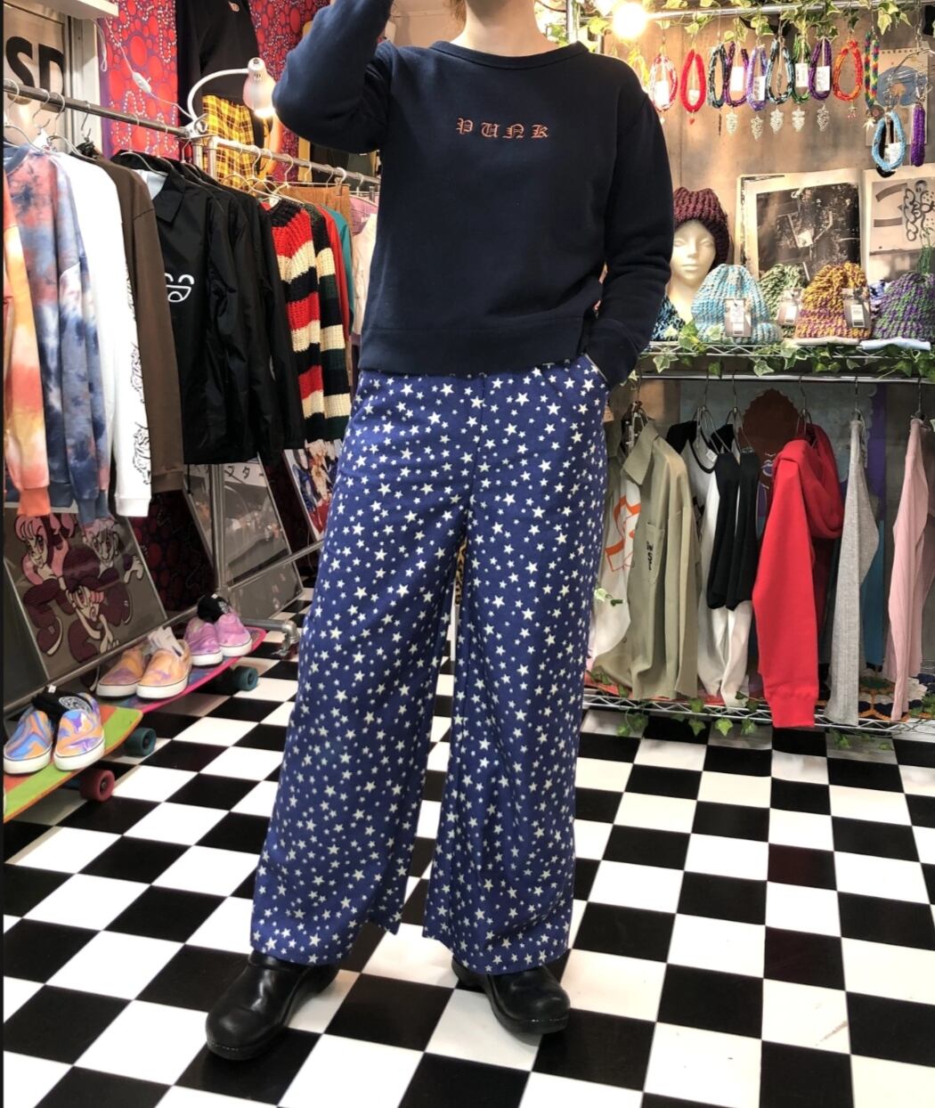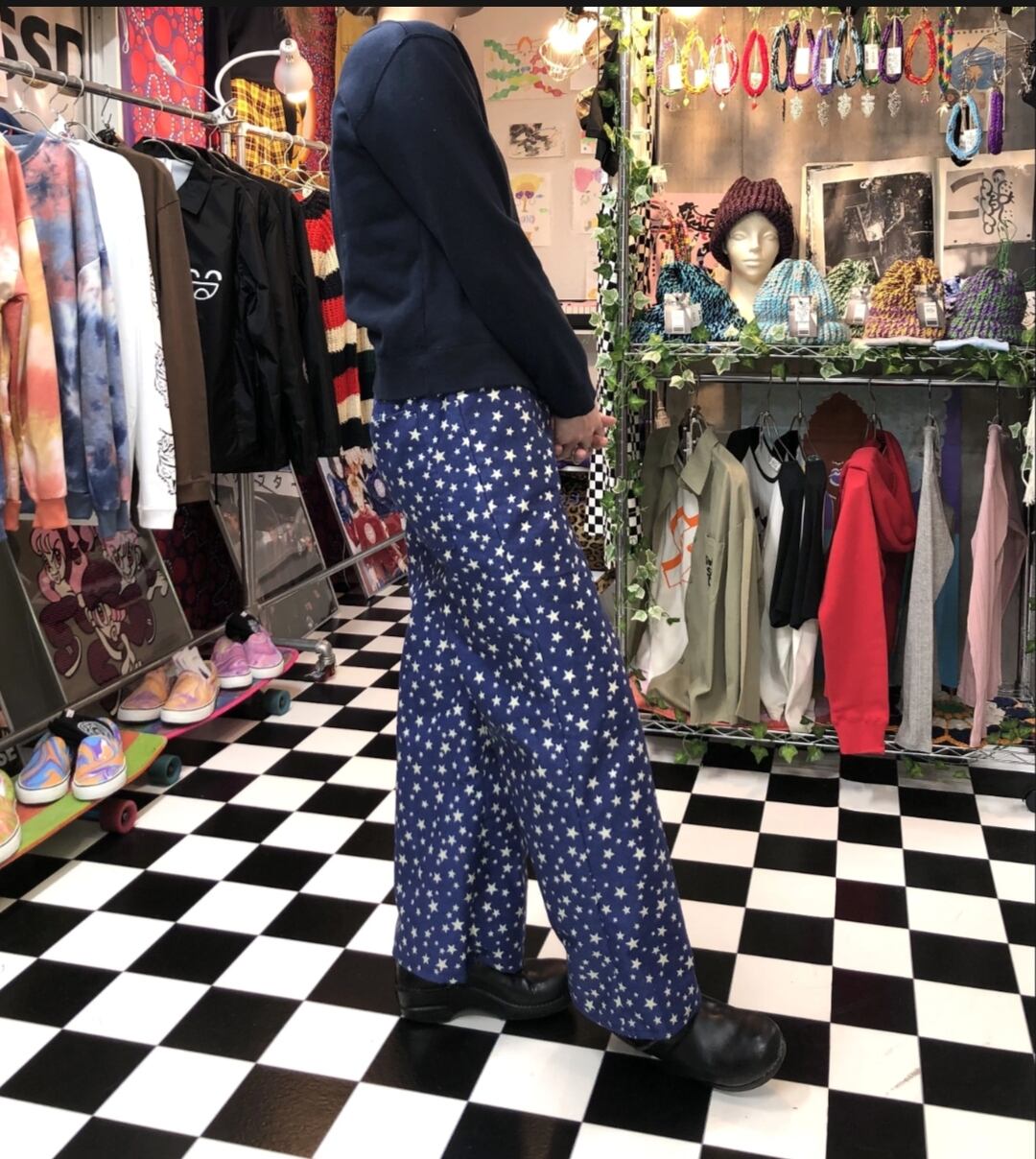 デニム調のブルーベースにラメ入りの星柄デザインのコットンワイドパンツ。