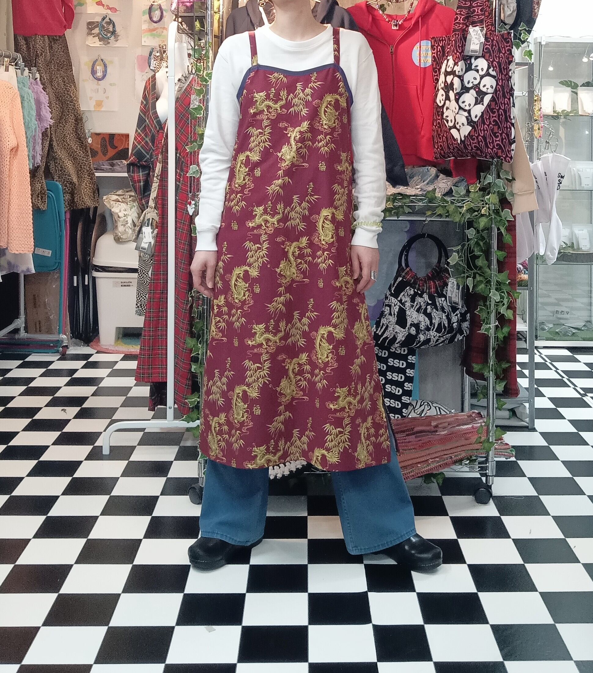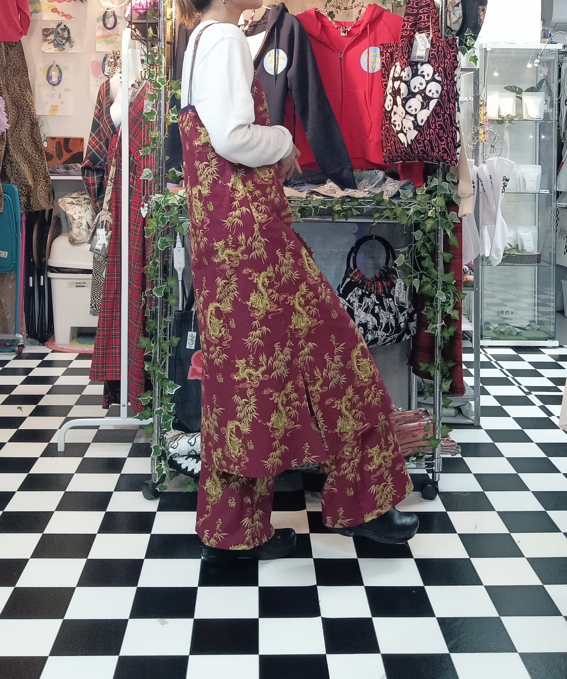落ち着いたワインレッドベースに龍×福×愛のチャイナ風コットン生地のキャミソールスリットロングワンピース。