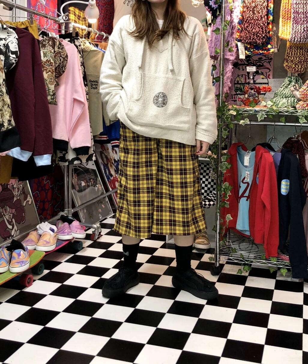 イエローチェック×サイドライン ワイドシルエットパンツ。