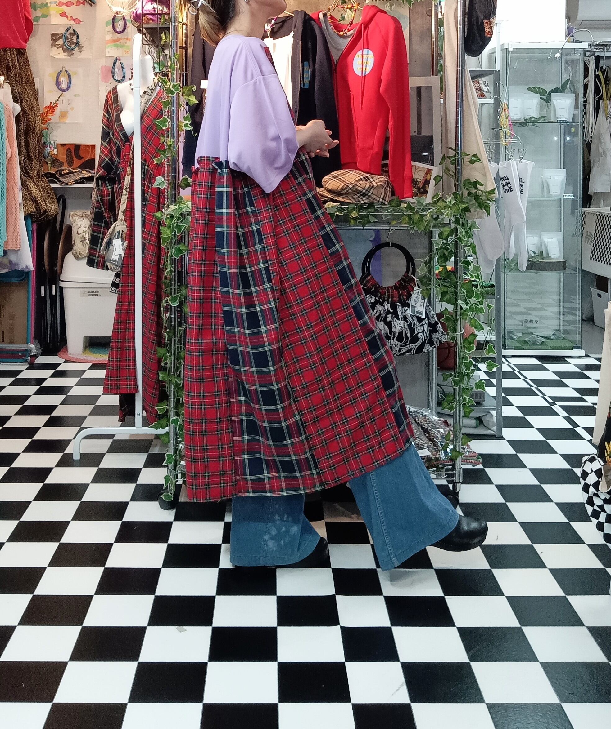ラベンダーカラーのドライTシャツをベースにミックスタータンチェックを合わせたオーバーシルエットワンピース。