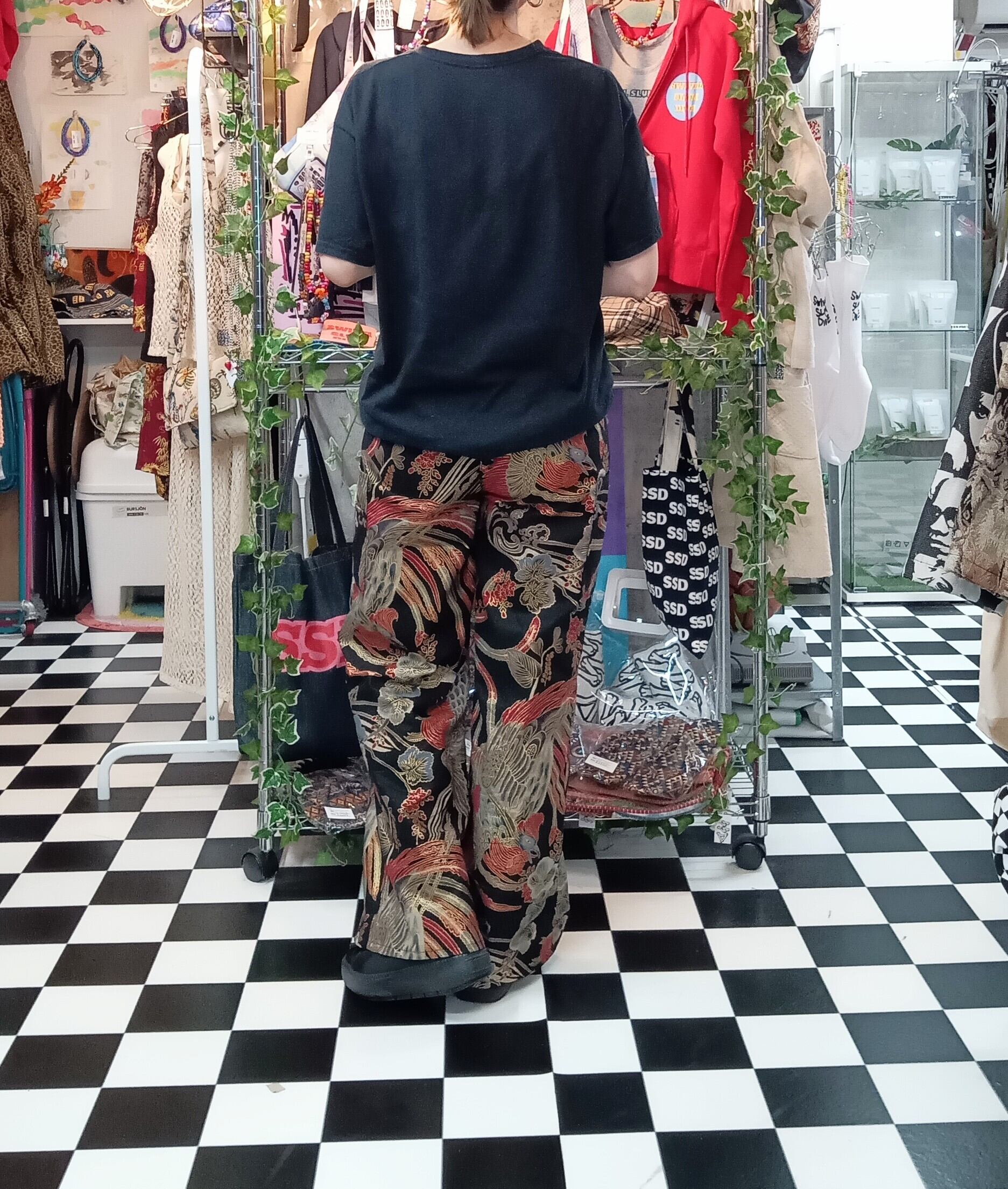 鳳凰 和柄コットンワイドパンツ:ブラック