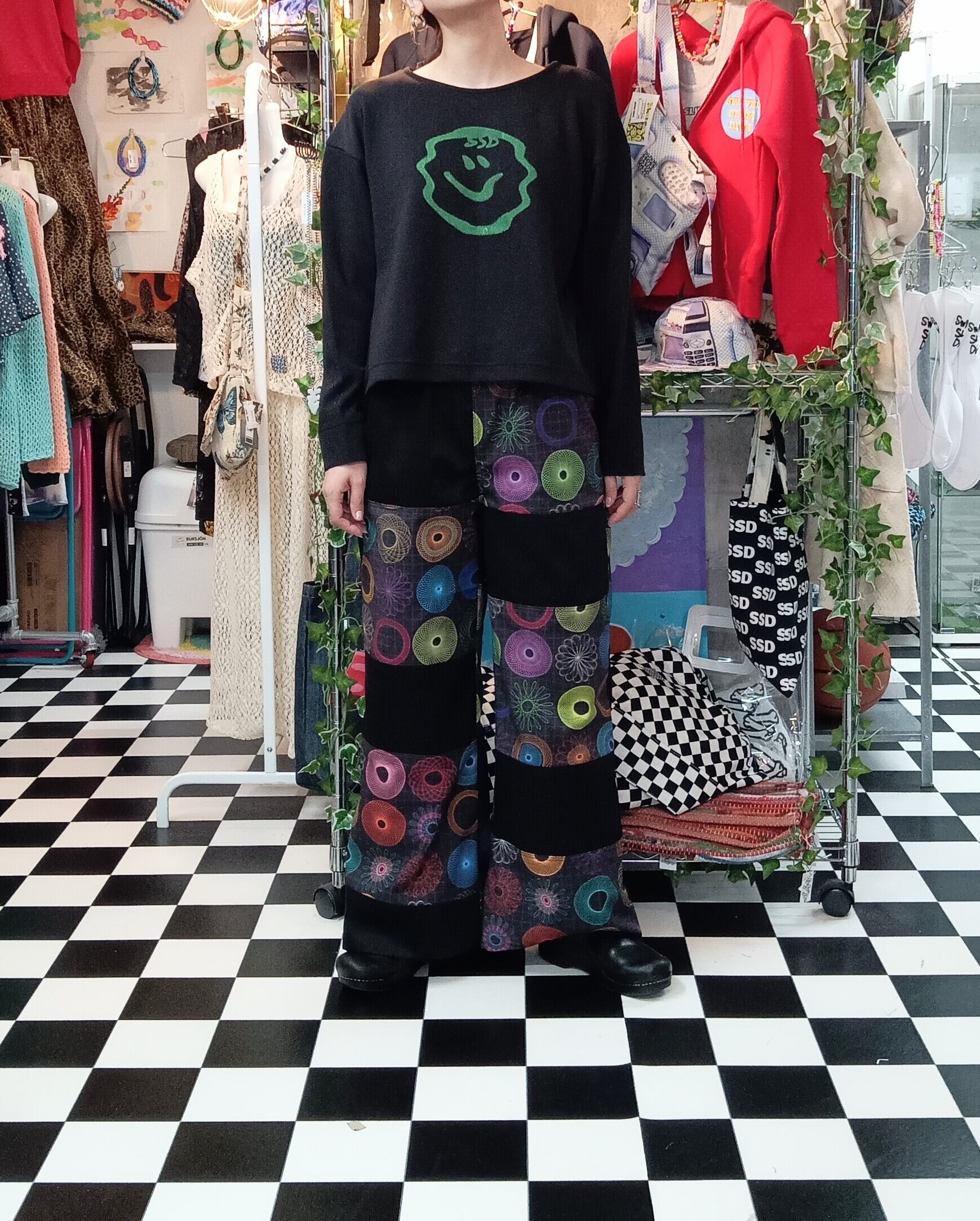 カラフルなアートグラフィックが散りばめられたデザイン生地とブラック生地を合わせた他にない一点。