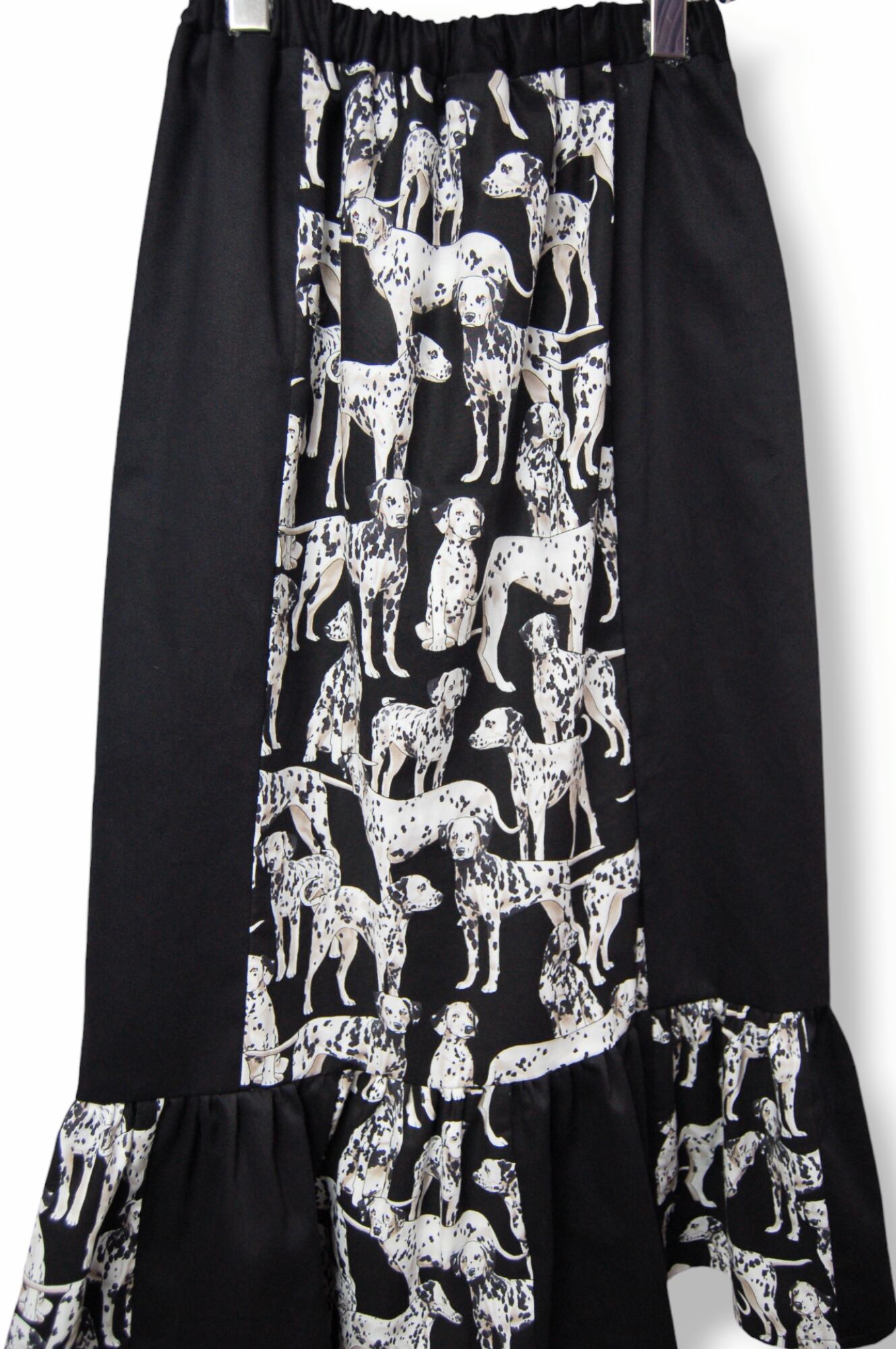 キュートなダルメシアンとブラックミックスデザイン 裾ギャザーロングスカート。